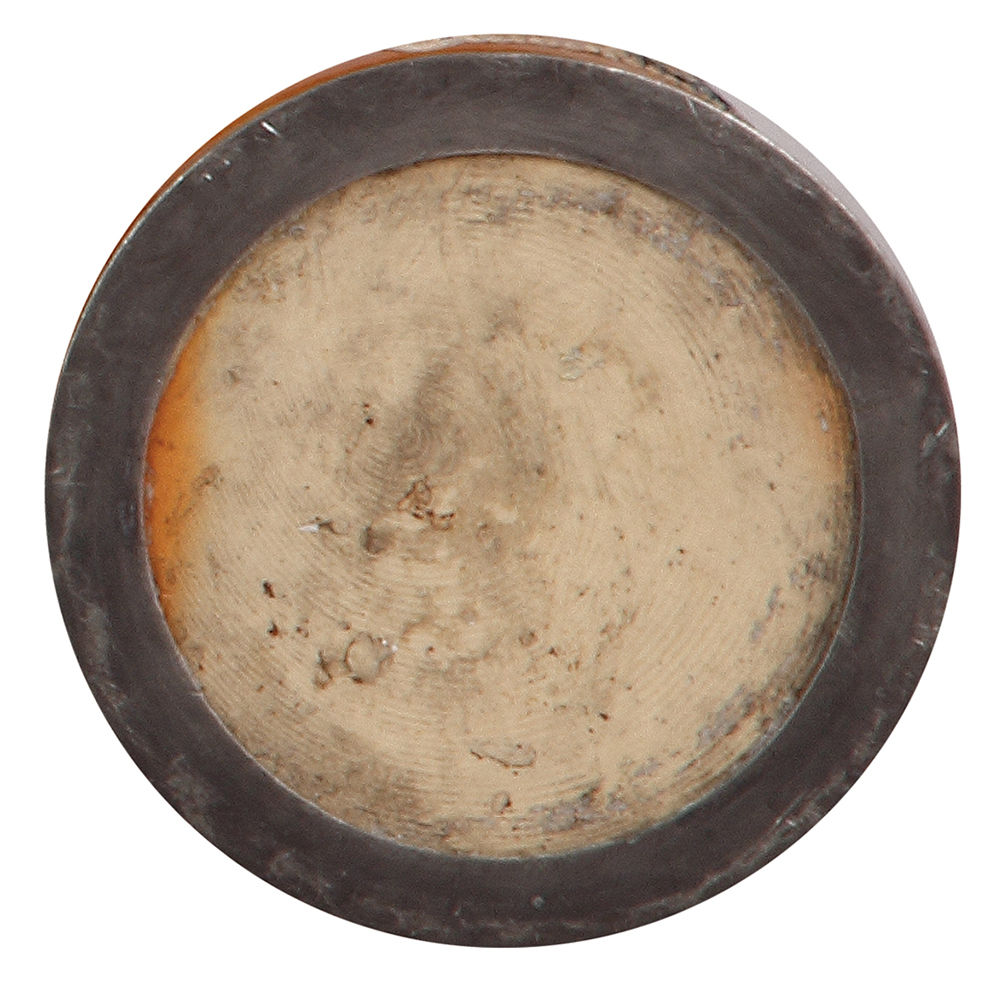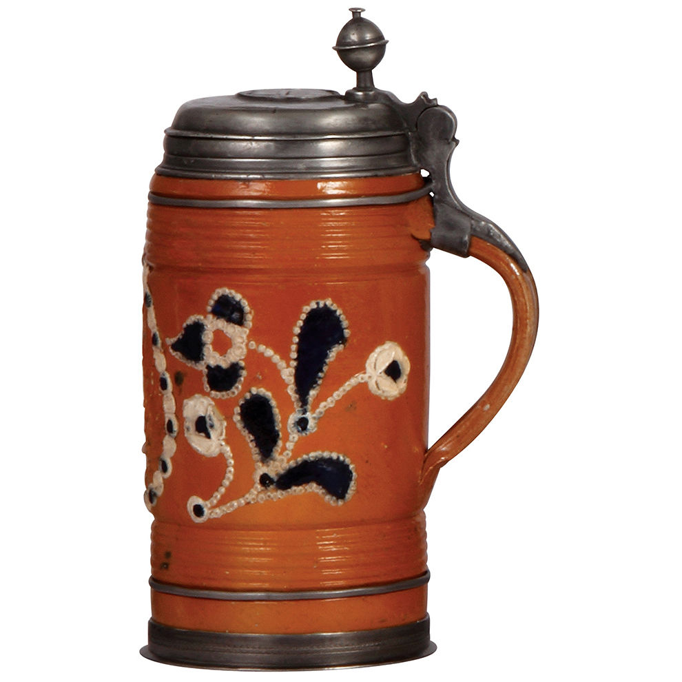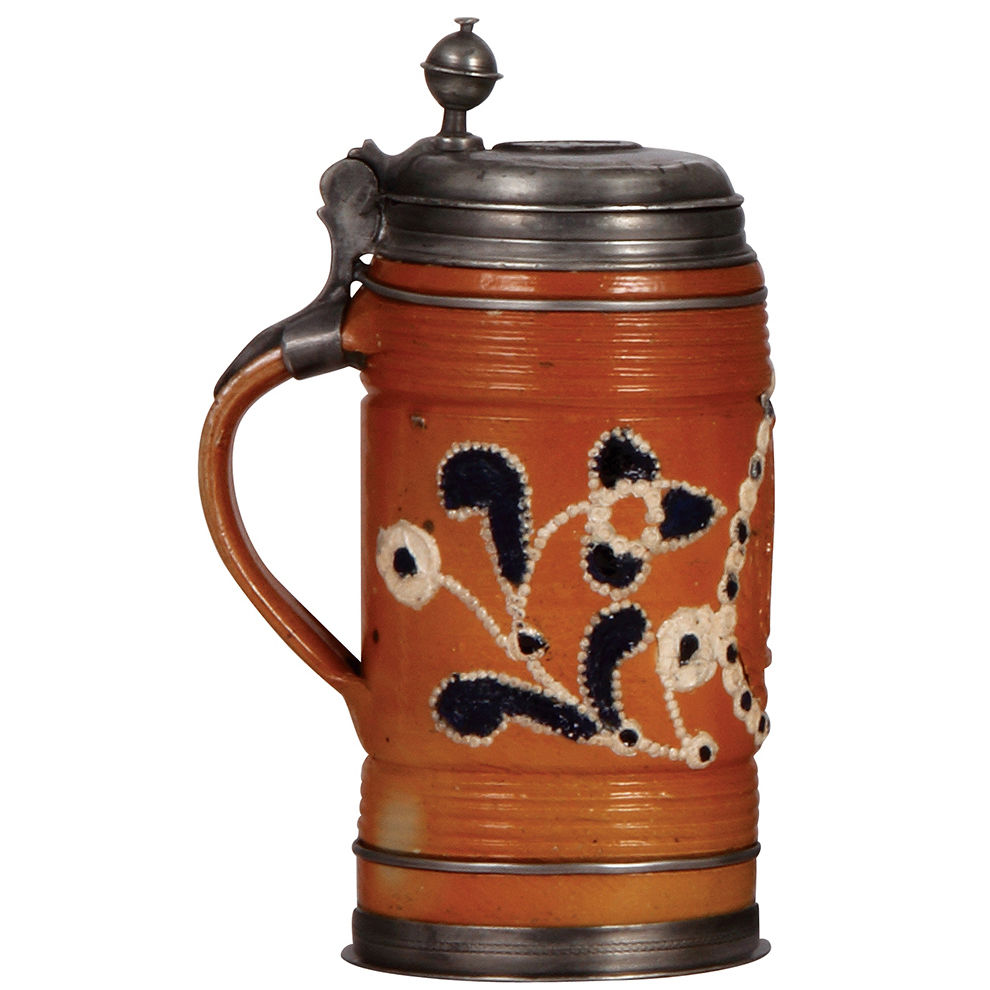 Altenburger Walzenkrug, 9.1” ht., mid 1700s, stoneware, relief & salt glazes, coat-of-arms, pewter lid, footring & belly bands, minor roughness to lid, otherwise very good condition.