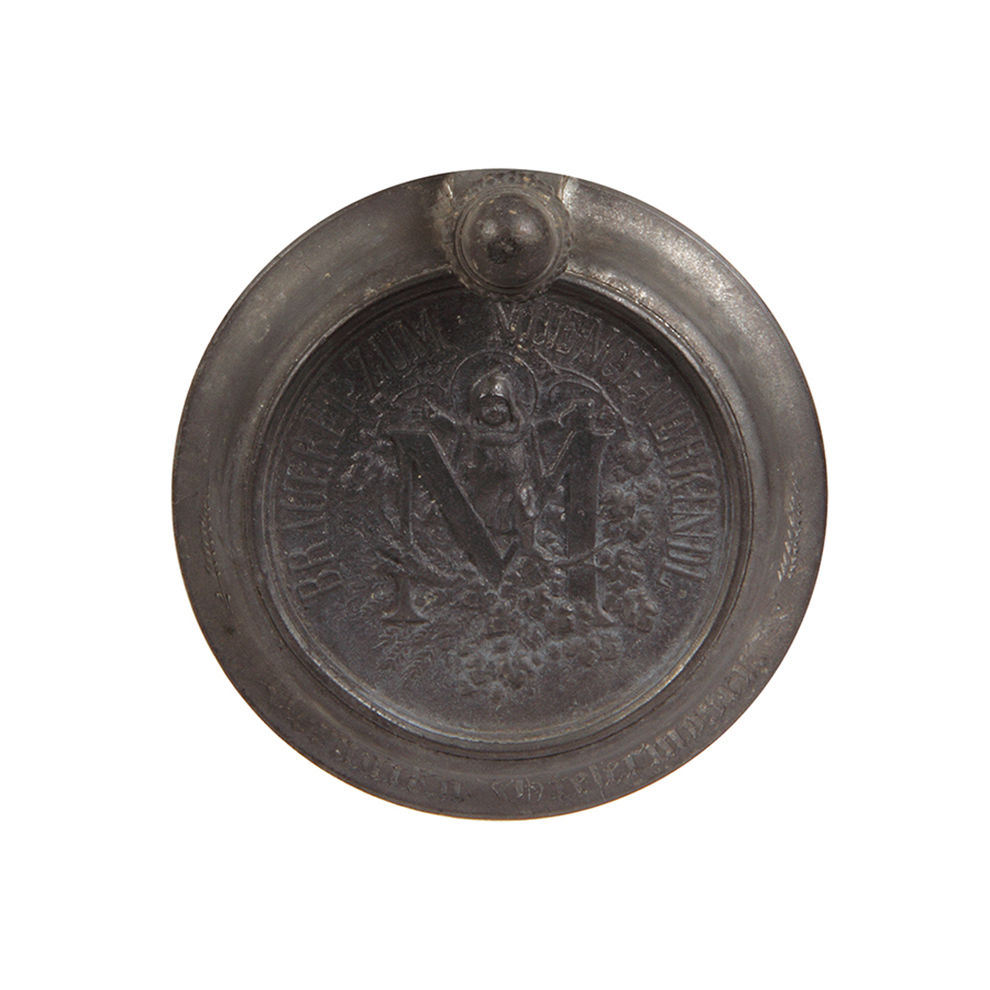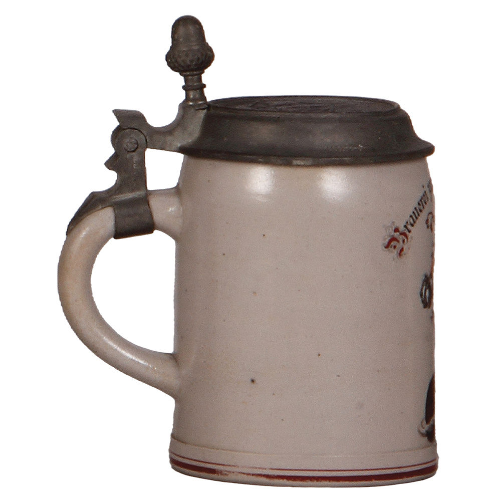 Brewery stein, stoneware, .5L, transfer & hand-painted, Brauerei zum Münchner Kindl, matching relief pewter lid, mint.