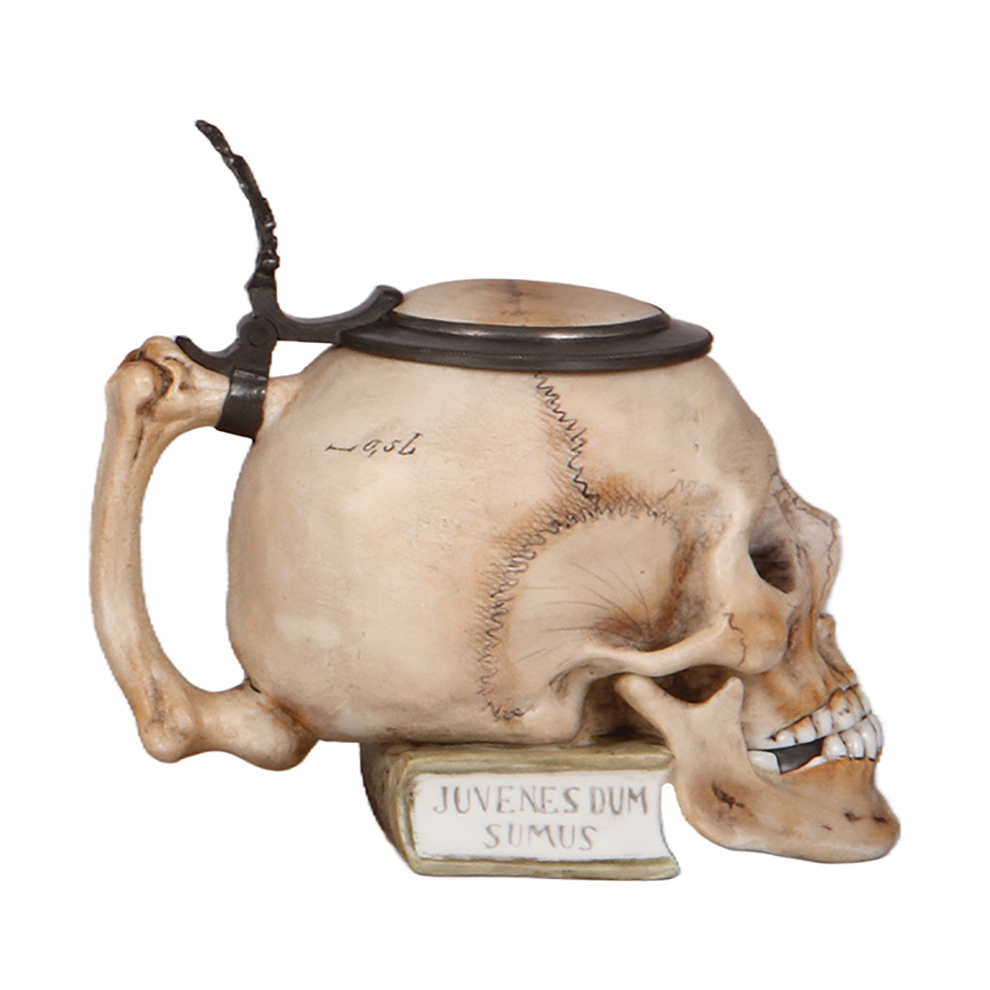 Character stein, .5L, porcelain, marked E. Bohne & Söhne, Skull on Book