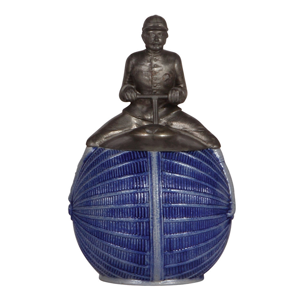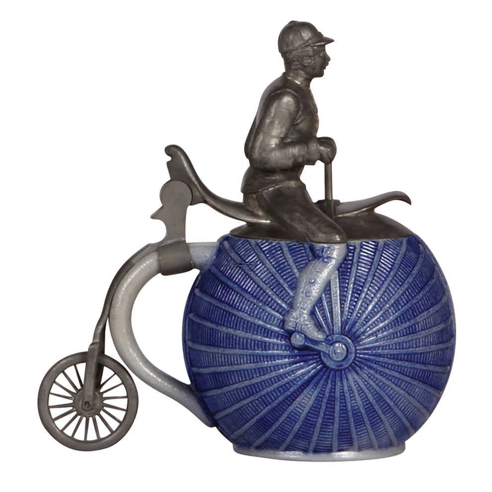 Character stein, .5L, stoneware, blue saltglaze, High-Wheel Bicycle, pewter figural lid, mint.