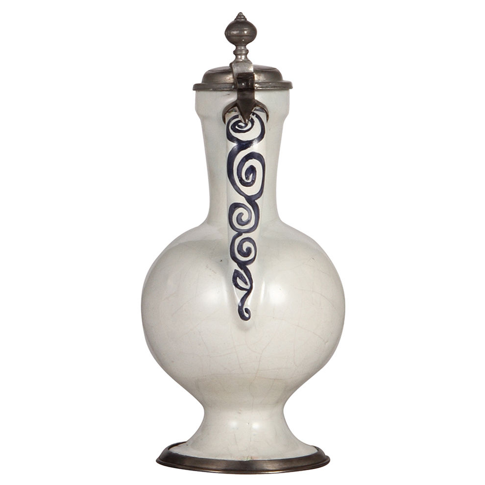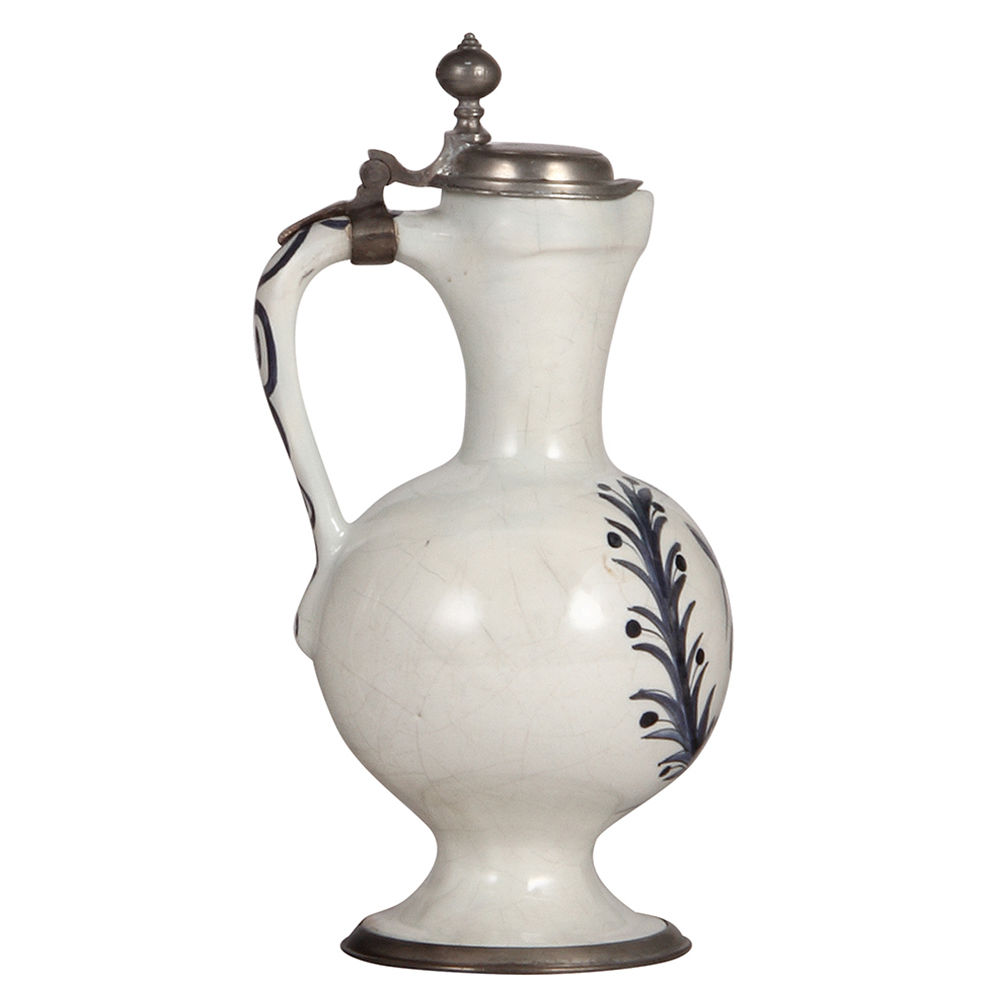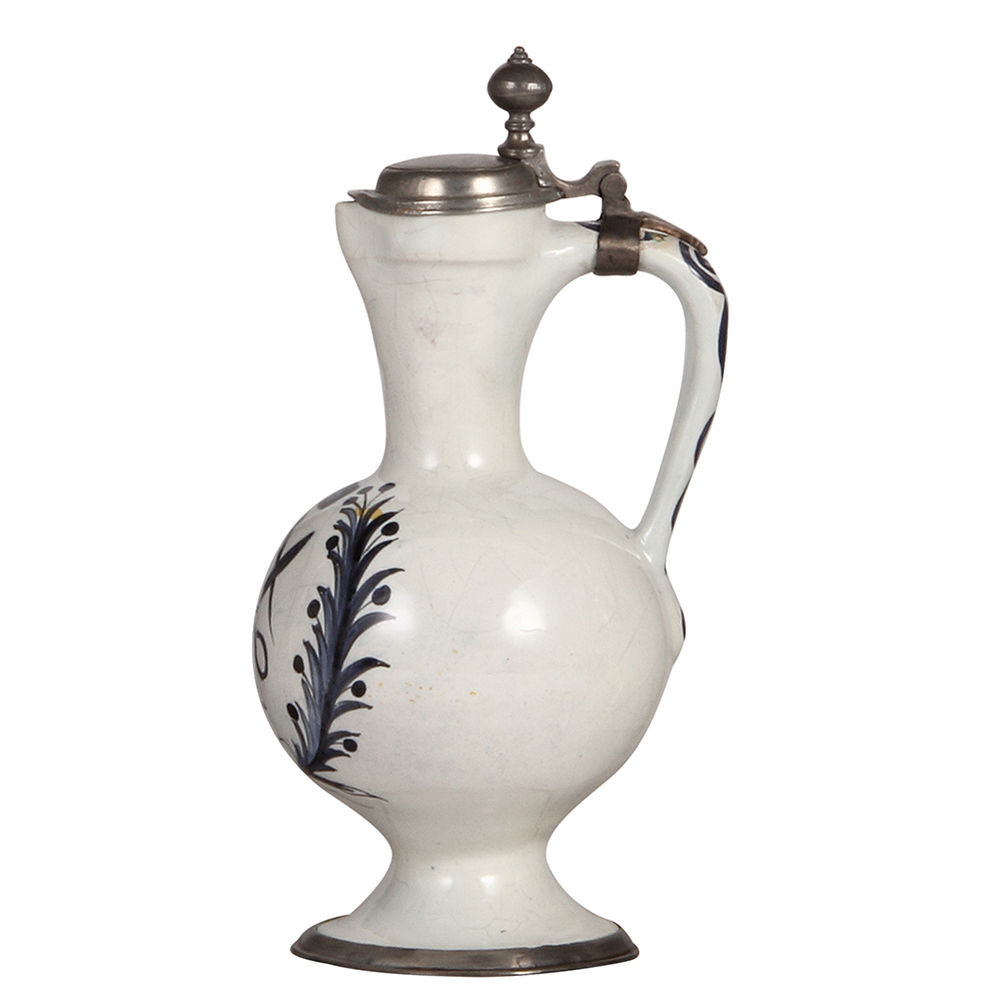 Faience stein, 10.8″ ht., Hanauer Enghalskrug, late 1700s, Tailor Occupation, pewter lid and footring, excellent restoration of chips.