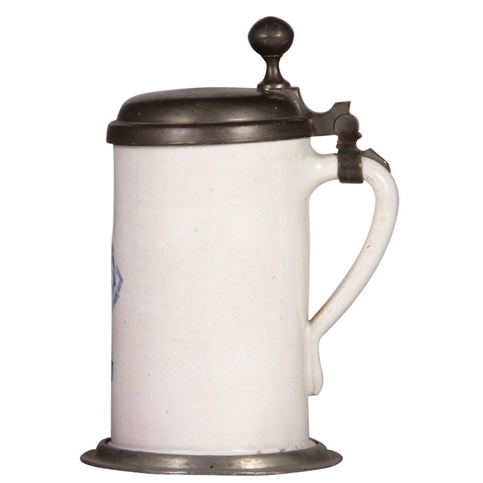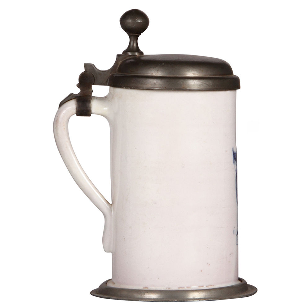 Faience stein, 9.6” ht., mid 1700s, possibly Hanauer Walzenkrug, S. Judas [Saint Jude Thaddaeus], pewter lid & footring, two tight hairlines in rear, excellent repair of rim flakes, pewter strap repaired.