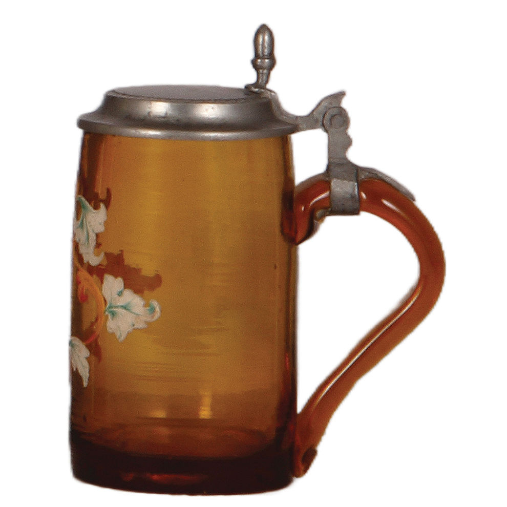 Glass stein, .25L, blown, orange, hand-painted, 1800s, pewter lid, mint.