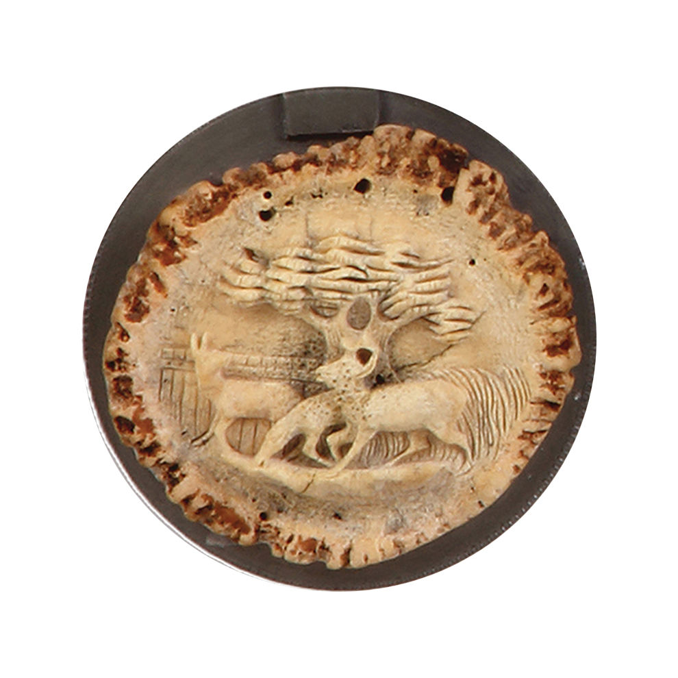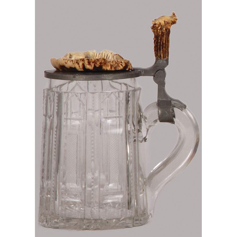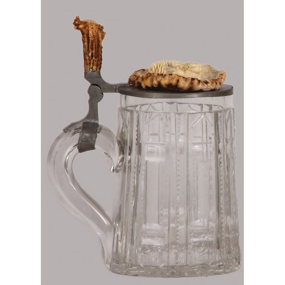 Glass stein, .3L, blown, cut, faceted, pewter lid with carved horn: three deer, horn thumblift, mint.