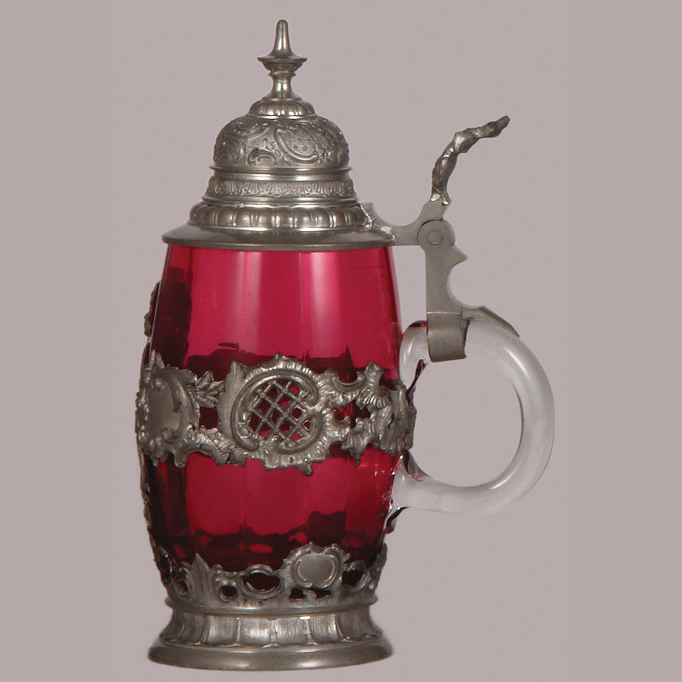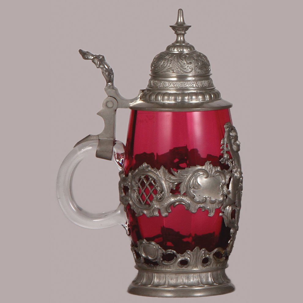 Glass stein, .5L, blown, cranberry, ribbed, elaborate pewter overlay with cherub, pewter lid, mint.