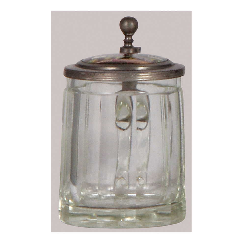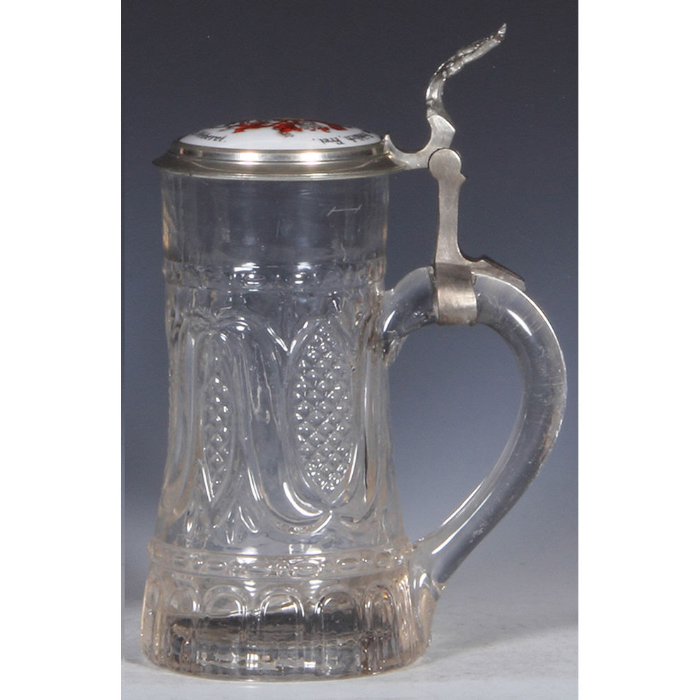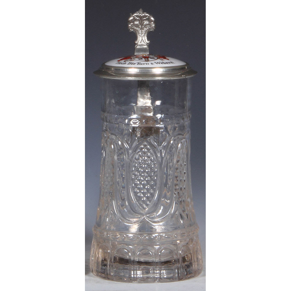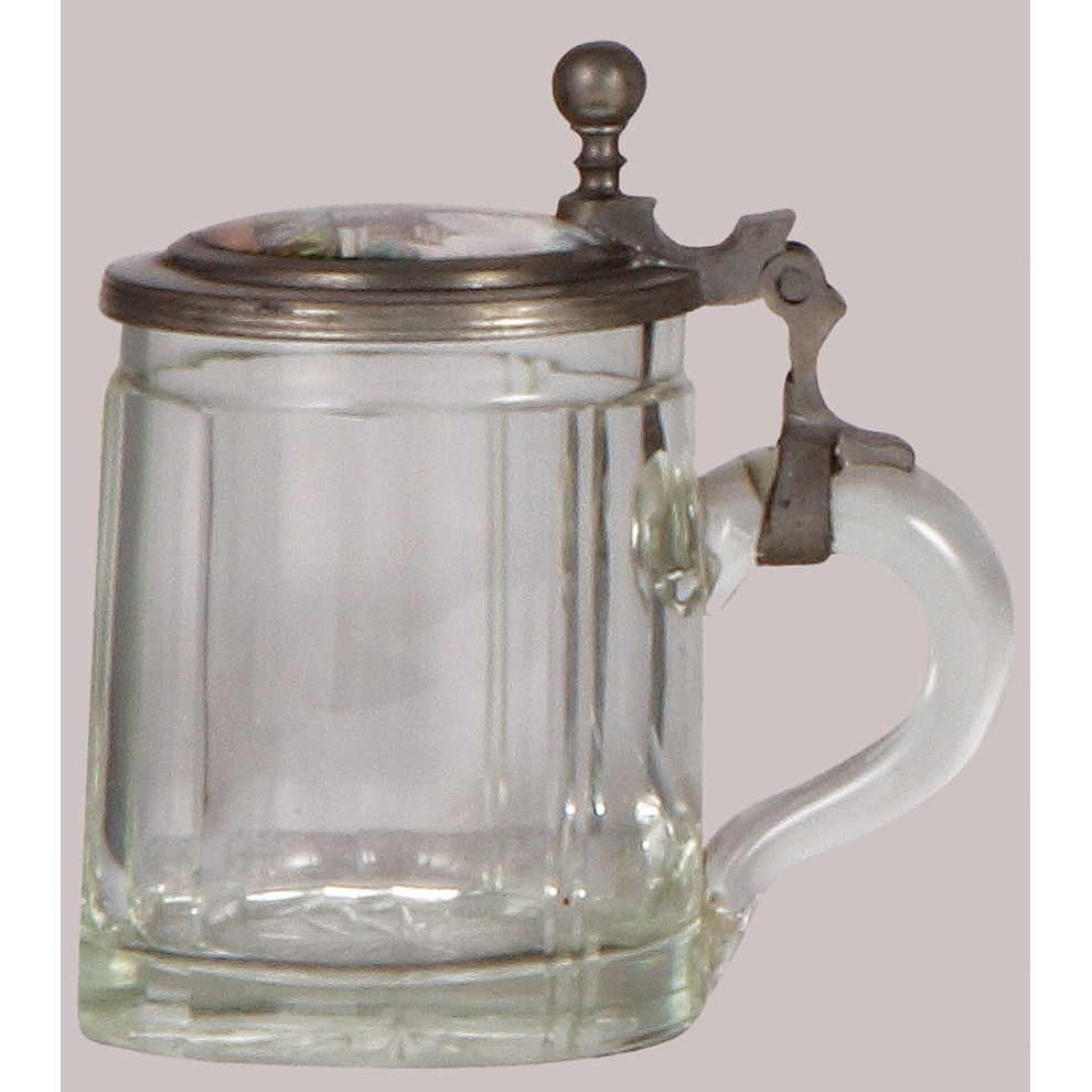 Glass steins, three, .5L, pewter lid with brass insert: miners and miner thumblift, mint; with, .5L, mold blown, clear, porcelain inlaid lid: Frisch, Fromm, Fröhlich, Frei; Hoch die Turn und Weberei, inscription inside lid dated 1907, mint; with, .25L, blown, clear, cut, porcelain inlaid lid: Bavaria statue and Ruhmeshalle at the Theresienwiese in München, fine detailed painting, mint.