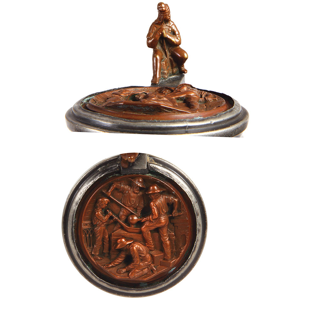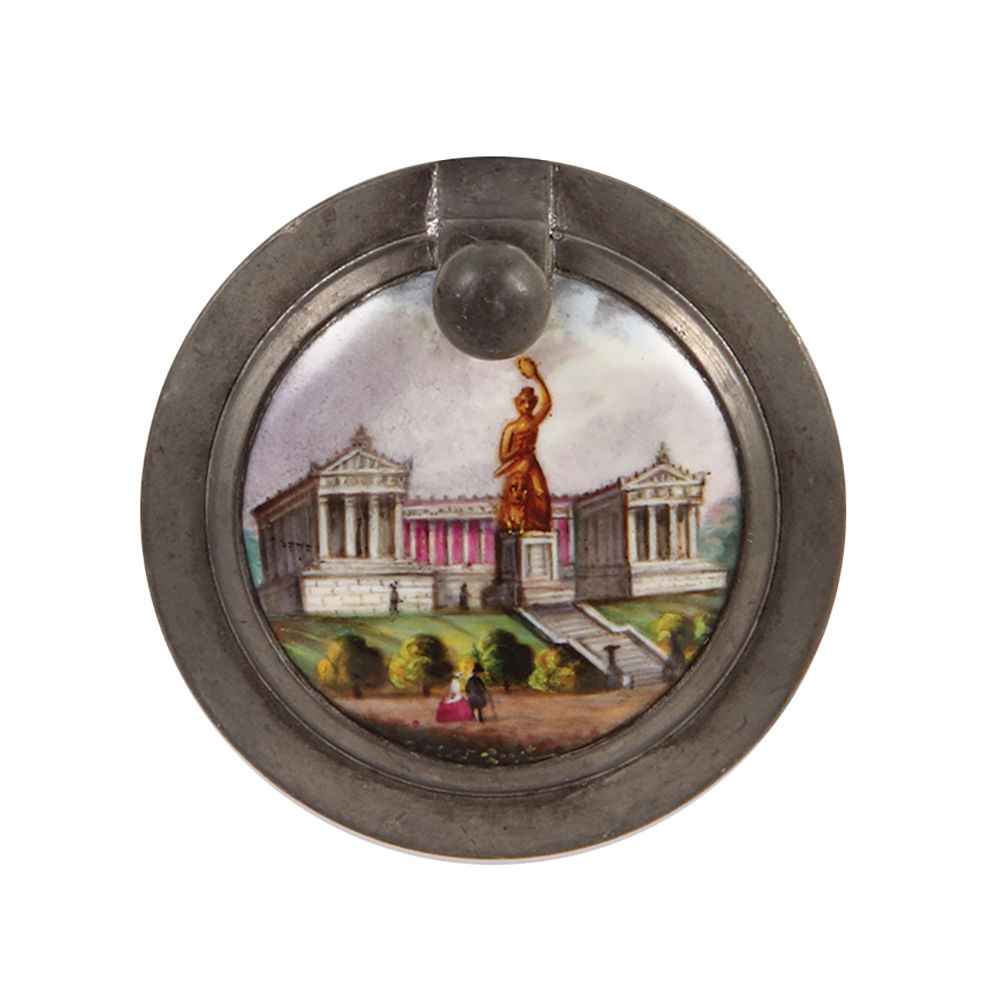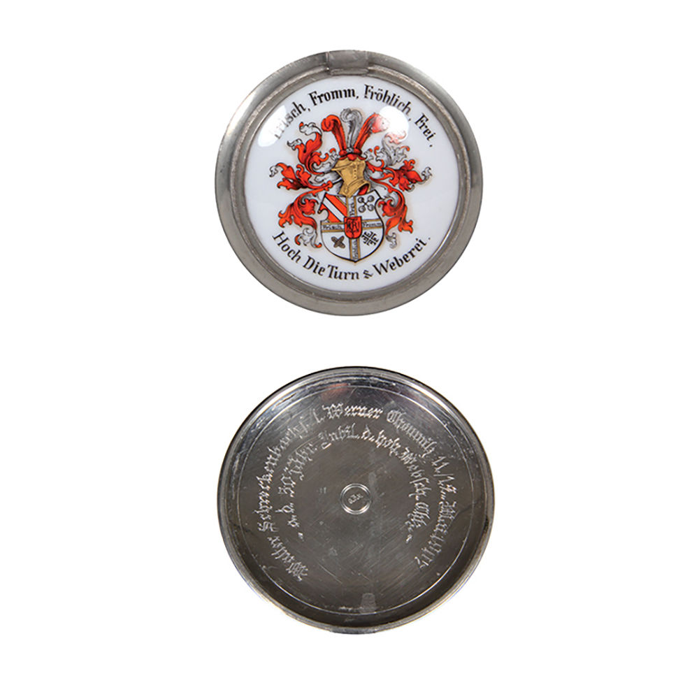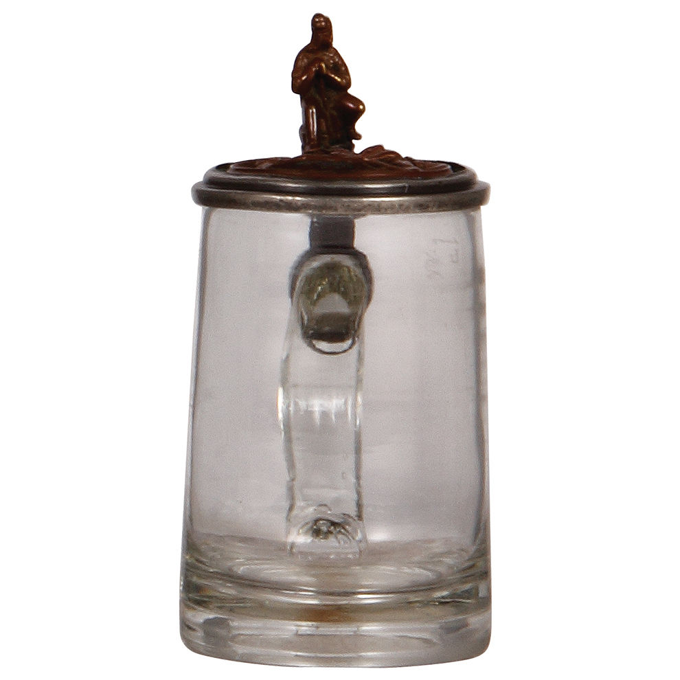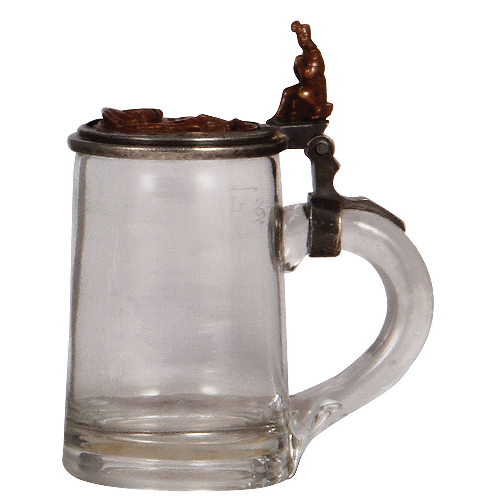 Glass steins, three, .5L, pewter lid with brass insert: miners and miner thumblift, mint; with, .5L, mold blown, clear, porcelain inlaid lid: Frisch, Fromm, Fröhlich, Frei; Hoch die Turn und Weberei, inscription inside lid dated 1907, mint; with, .25L, blown, clear, cut, porcelain inlaid lid: Bavaria statue and Ruhmeshalle at the Theresienwiese in München, fine detailed painting, mint.