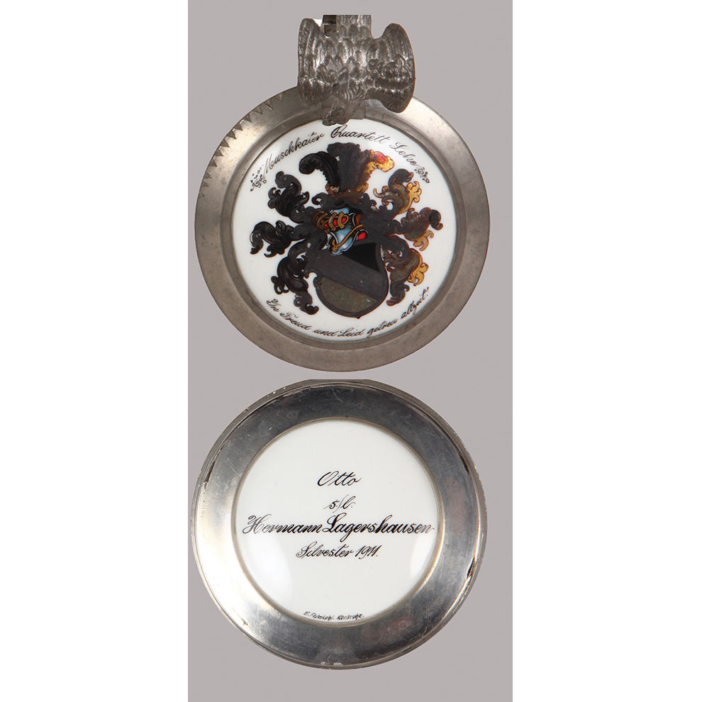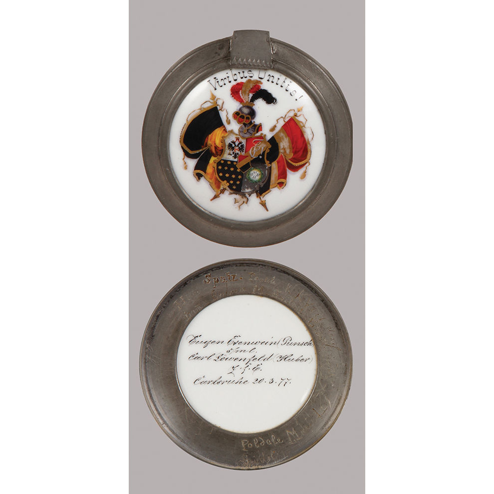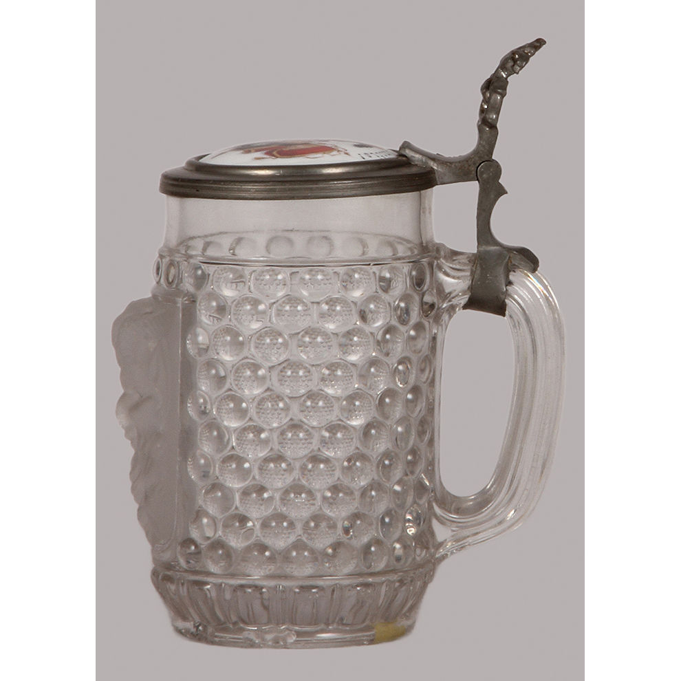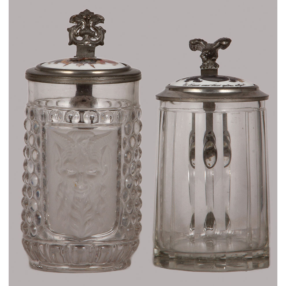 Glass steins (two), .5L, mold blown, porcelain inlaid lid: Virib Unities!, 1877, some wear on the glass & two small chips on bottom rim; with, .5L, blown, faceted, porcelain inlaid lid: Musckkater Ruartett Lehe, 1911, small flakes on glass.