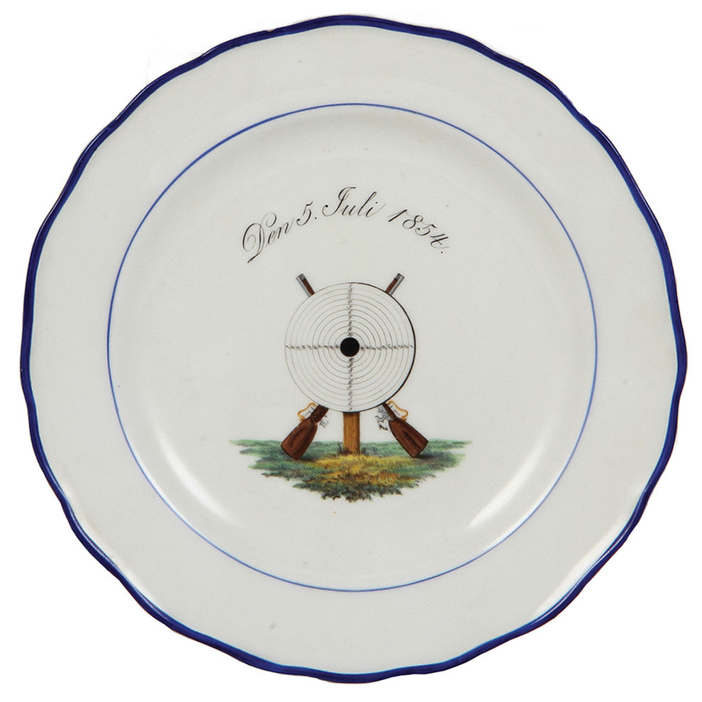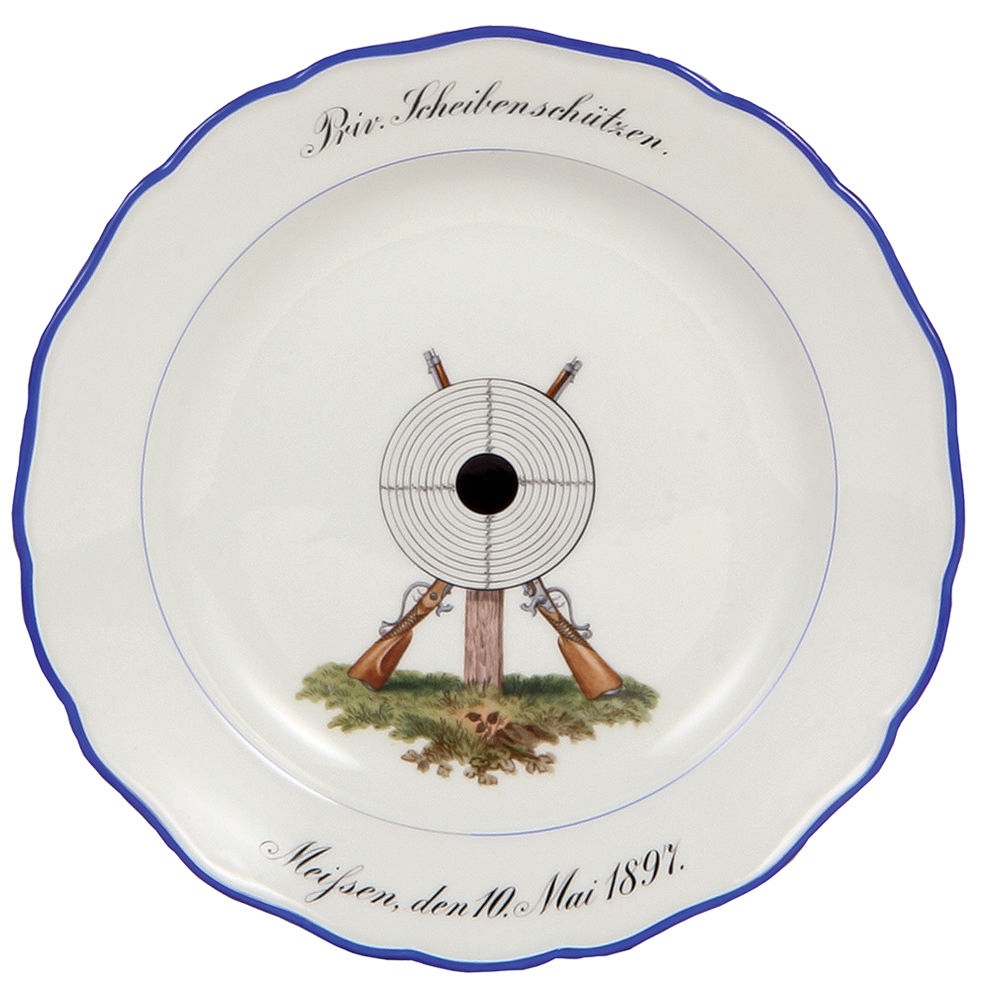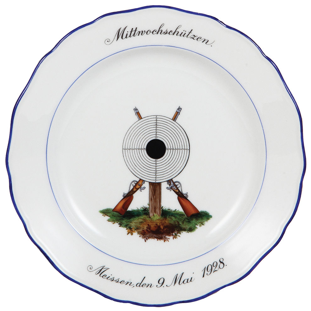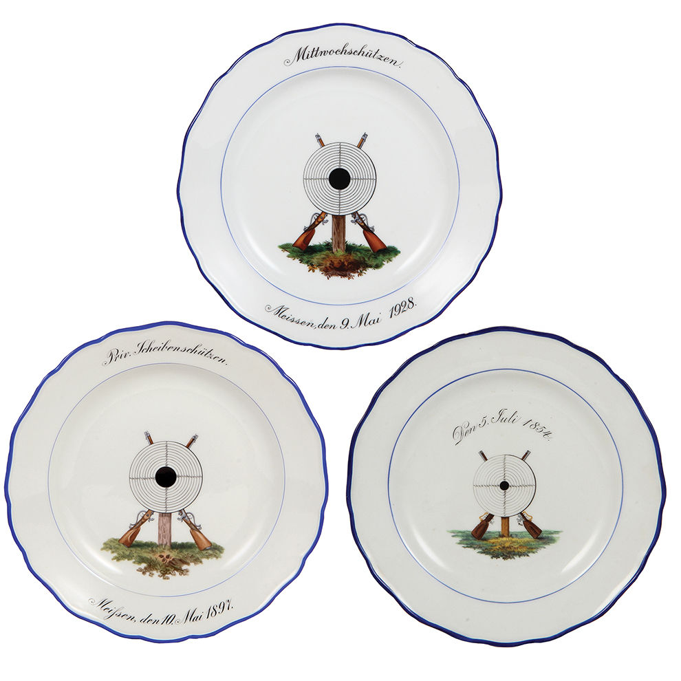 Meissen plates (three), 10.0″ d., Meissen crossed swords mark, (shooting festivals), Mittwochschützen, Meissen 9. Mai 1928, Priv. Scheibenschützen, Meissen 10. Mai 1897, Schützen, Den 5. Juli 1854, all are mint.