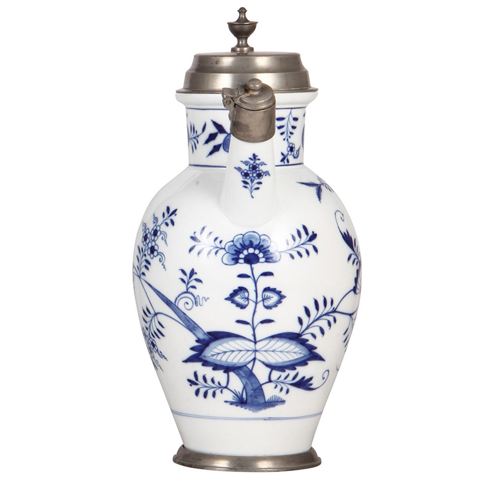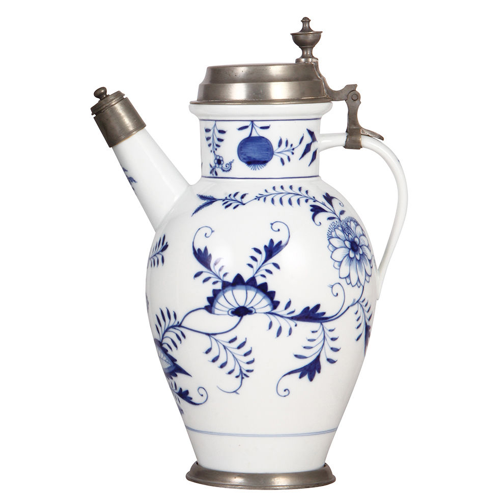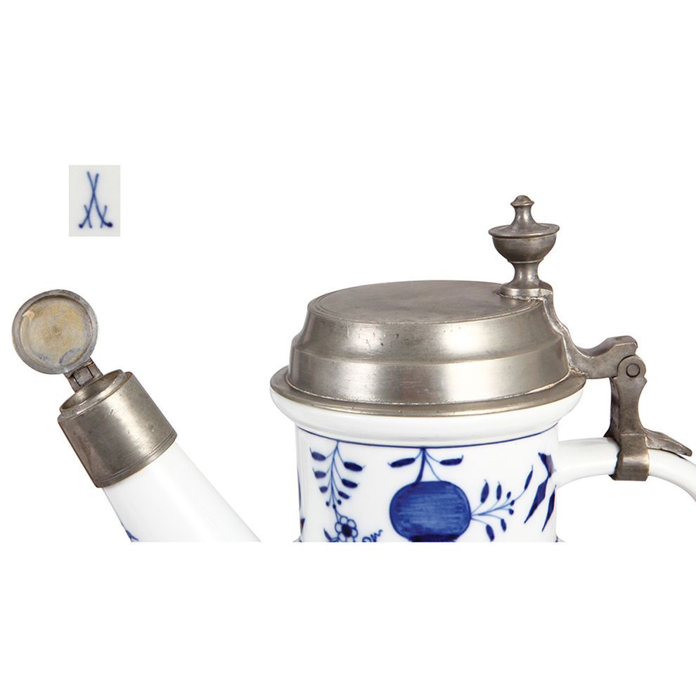 Meissen porcelain Tüllenkanne, 2.5L, 15.2″ ht., marked with crossed swords, c.1880, hand-painted, blue onion pattern first used in 1739 with popularity peaking in the early 20th Century, pewter lid, spout cap & base ring, large size, mint.