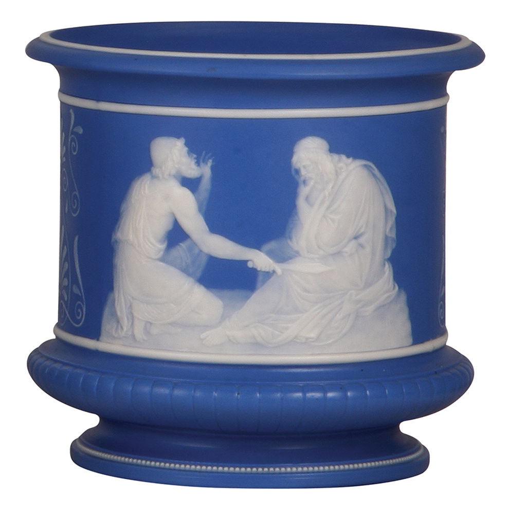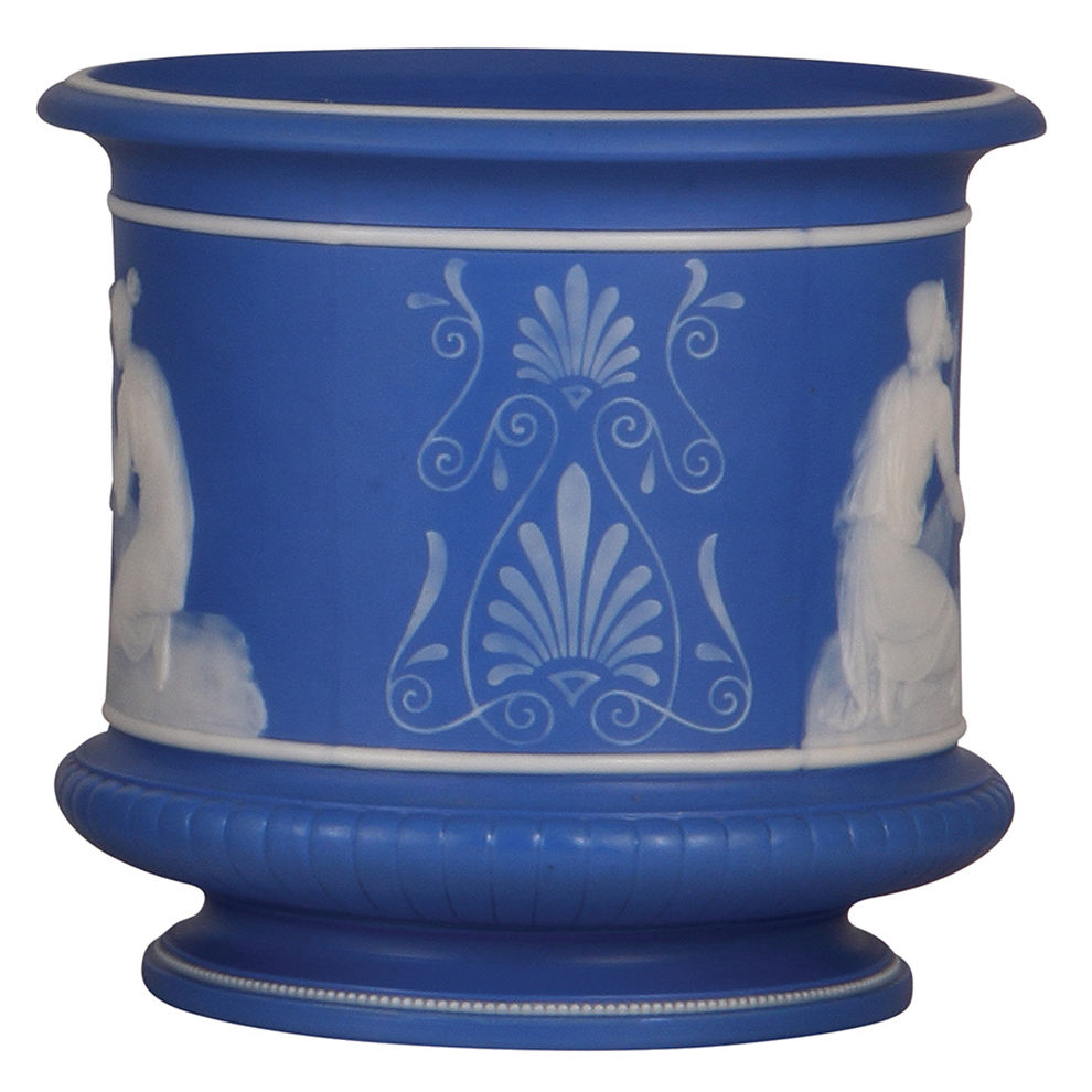 Mettlach flower pot, 7.3″ ht., 7001, phanolith, blue background, very rare, mint.