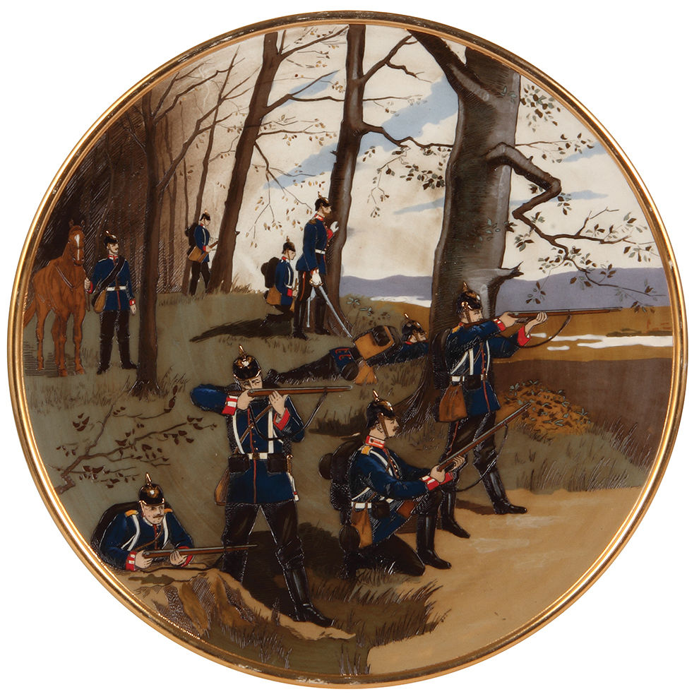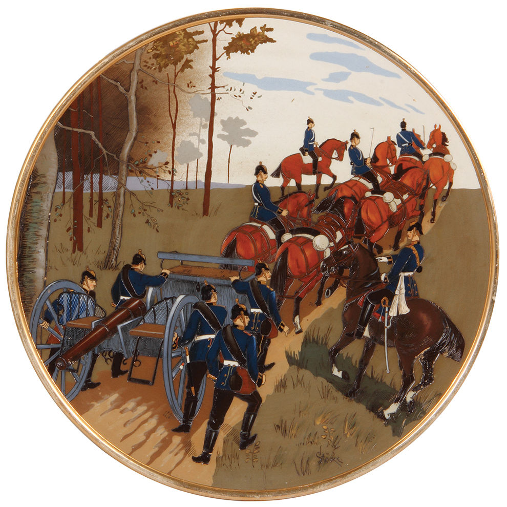 Mettlach plaques, 15.2″d., 2146 & 2147, etched, by Stöcke, Infantry & Artillery, a little gold wear.