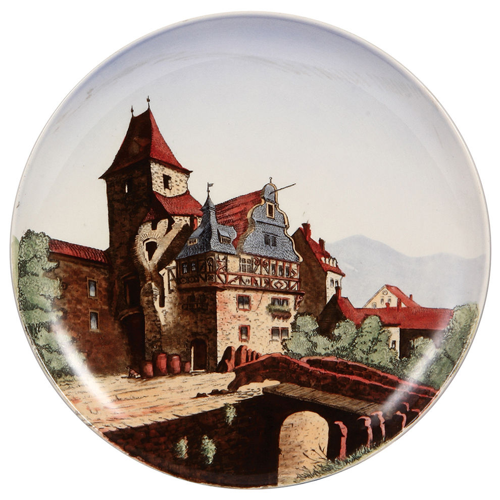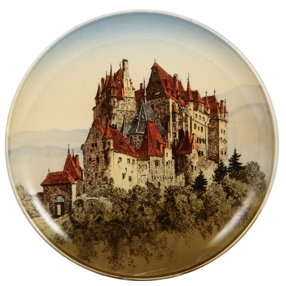 Mettlach plaques (pair), 12.0″ d., 94 & 95 [1044], PUG, Altes Stadtthor Cochem, Burg Eltz, mint.