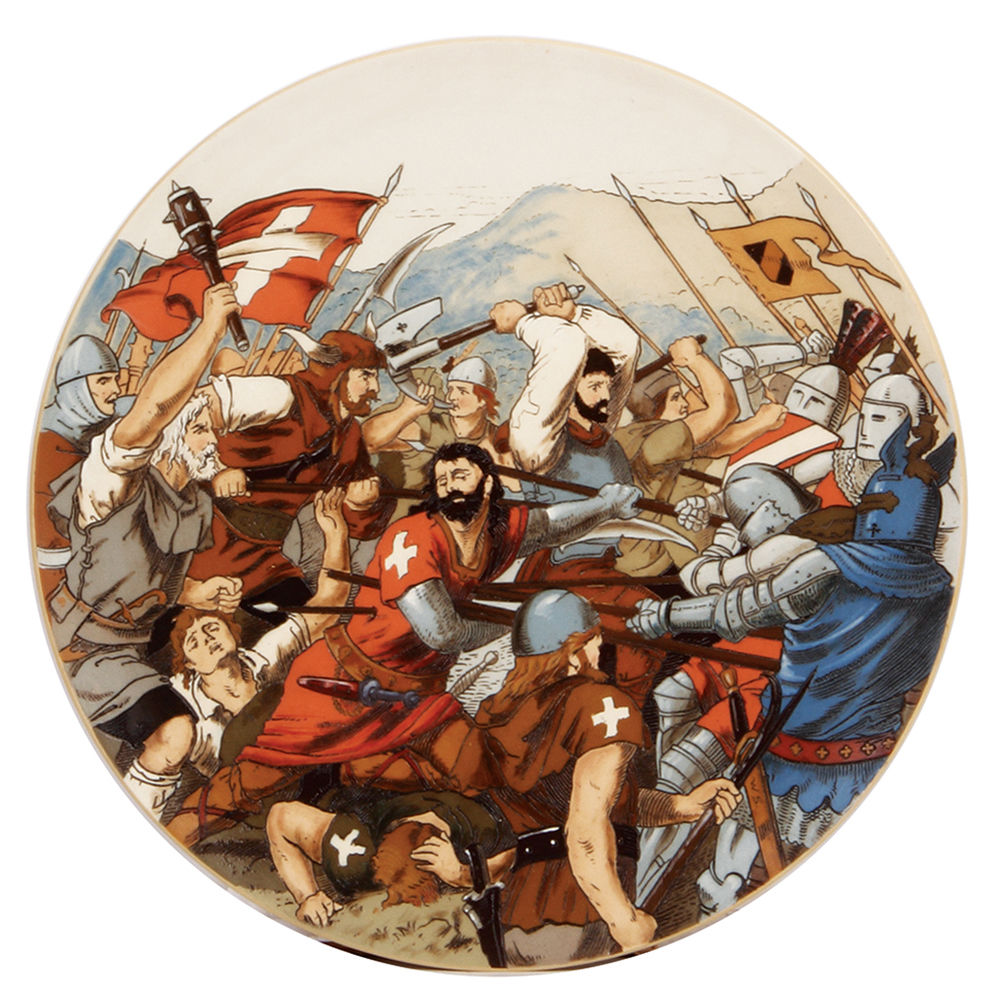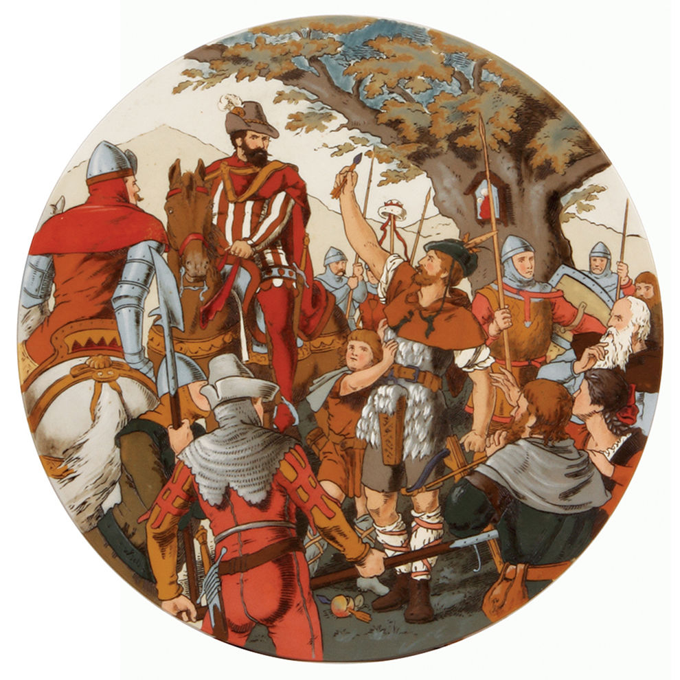 Mettlach plaques (pair), 14.4″ d., 1769 & 1770, etched, by W. Sch. 1887, Arnold von Winkelried & Wilhelm Tell, mint. Listed in The Mettlach Book (2005) for $1800 to $2400. Often sold over $2500 in the 1980’s and 1990s.