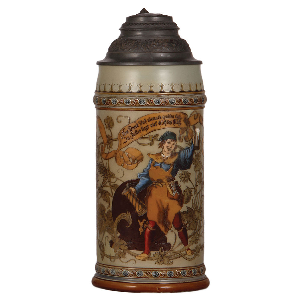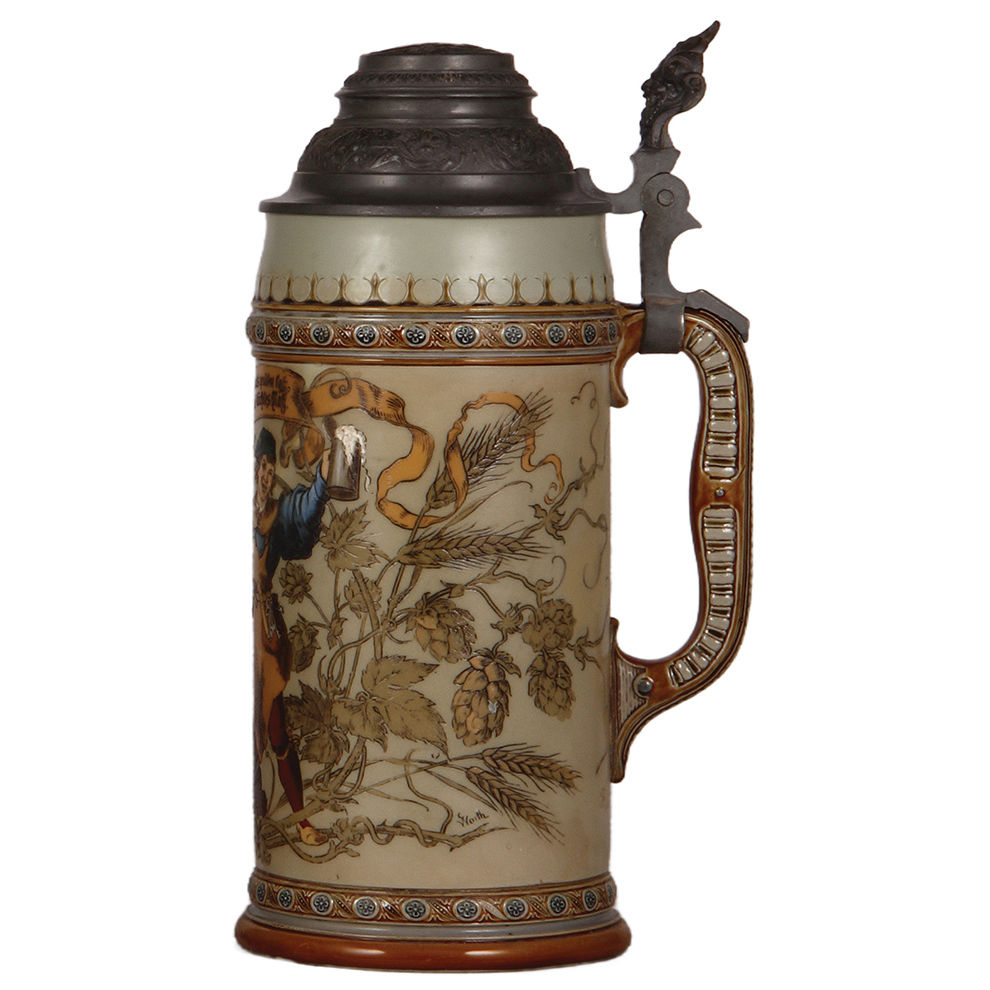 Mettlach stein, 3.0L, 14.1″ ht., 1941, etched, pewter lid, cracks in rear poorly repaired.