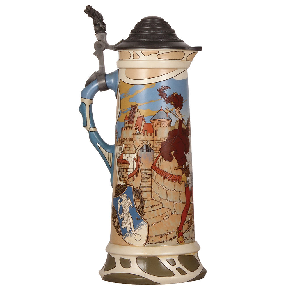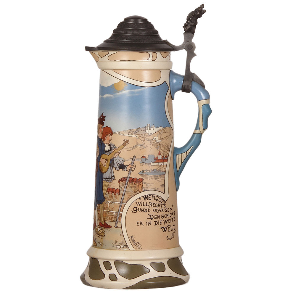 Mettlach stein, 3.5L, 17.1″ ht., 2825, etched, by H. Schlitt, old pewter lid, excellent pewter & body repair by handle.