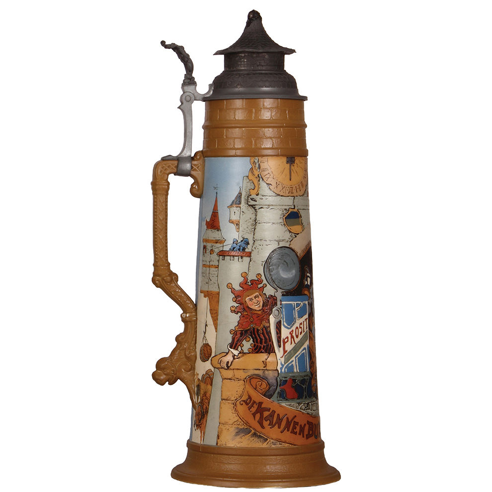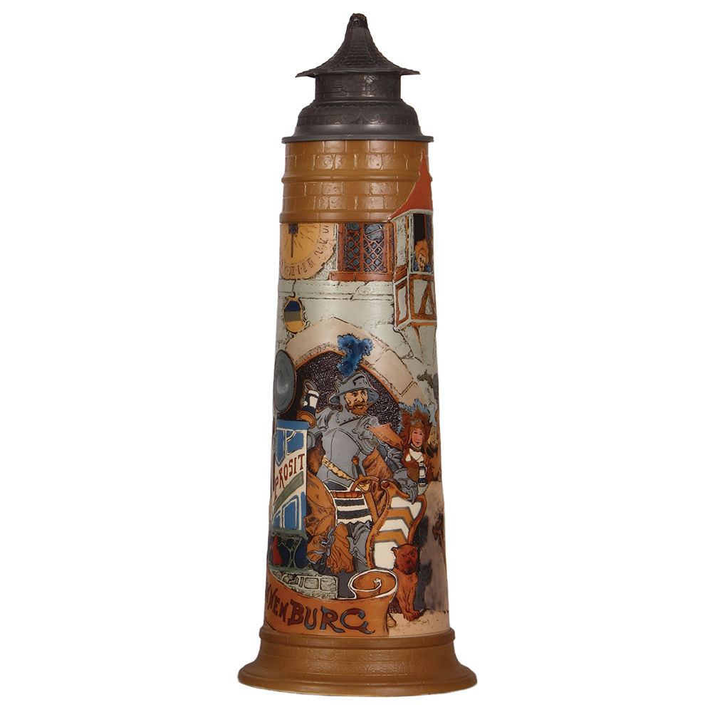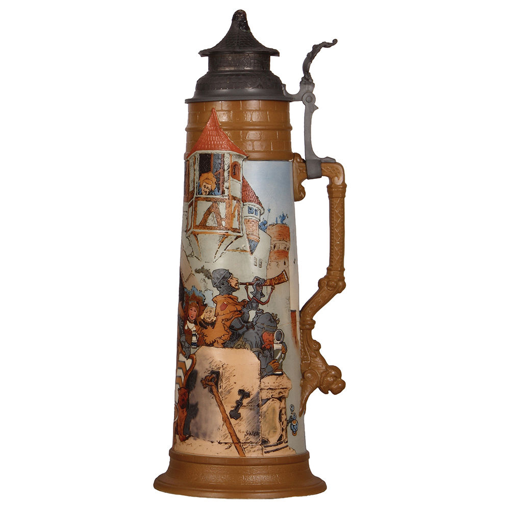 Mettlach stein, 4.2L, 22.0″ ht., 2524, etched, by H. Schlitt, De Kannenburg, pewter lid, finial damaged, breaks in body & base glued.