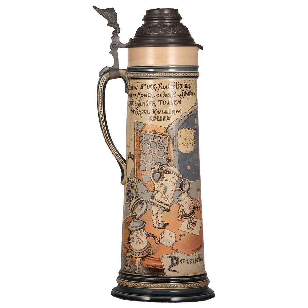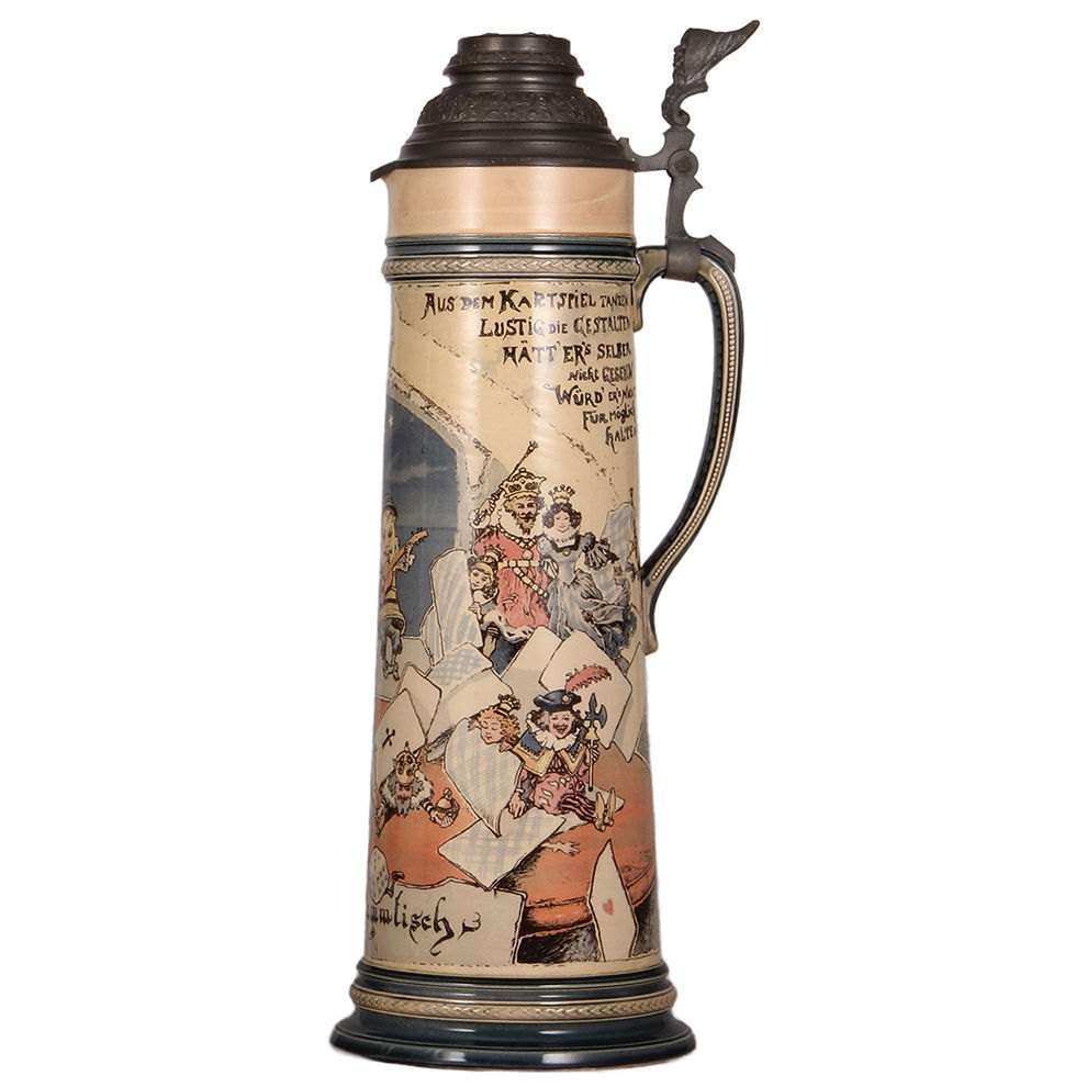 Mettlach stein, 4.8L, 20.5″ ht., 1059[2488], PUG, by H. Schlitt, elaborate card game scene, pewter lid, rare, mint.