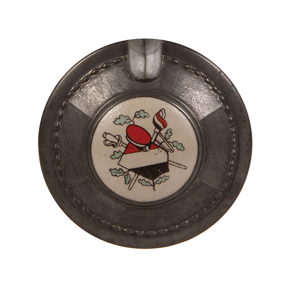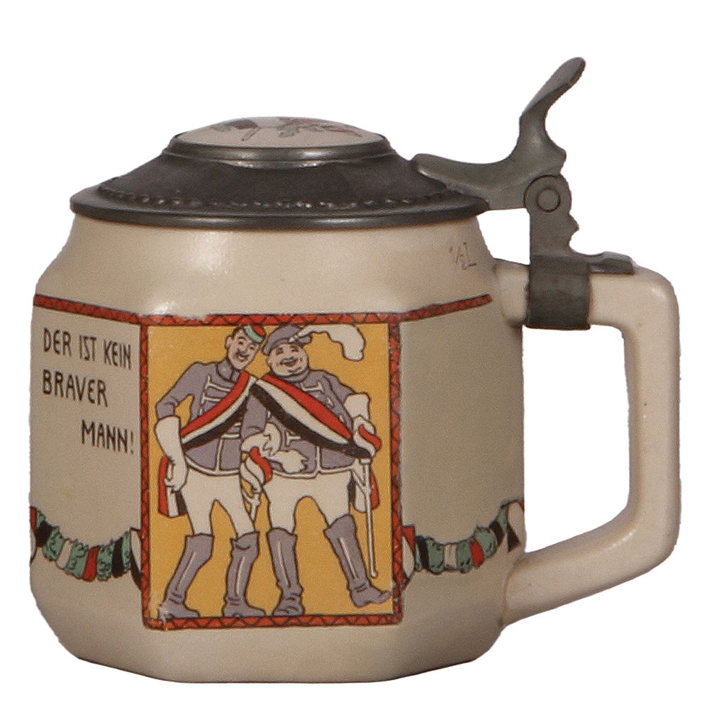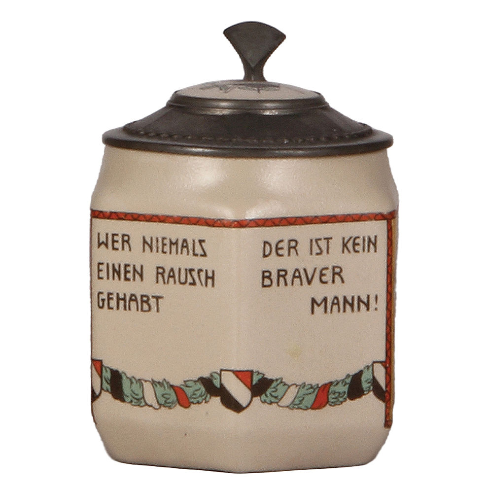 Mettlach stein, .5L, 552[3344], Bavaria, Fraternity students, inlaid lid, excellent repair of 3″ hairline in rear.