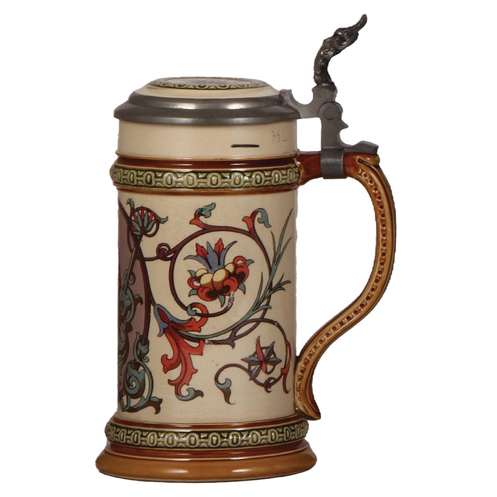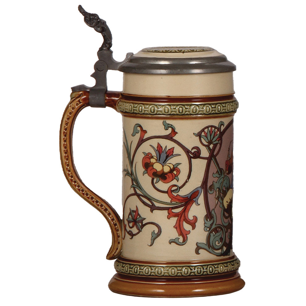 Mettlach stein, .5L, 581[1530], PUG, by Buch 1886, inlaid lid, mint.