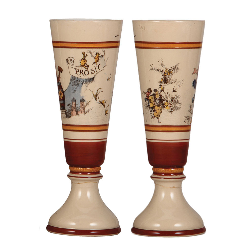 Mettlach stein & Pilsner beaker, 1.0L, 2585, etched, Münchener Kindl & München, inlaid lid, inlay crack, body mint; with, .5L, 10.9″ ht., beaker, 1014[2775], PUG, by H. Schlitt, Münchener Kindl, pedestal base break glued.