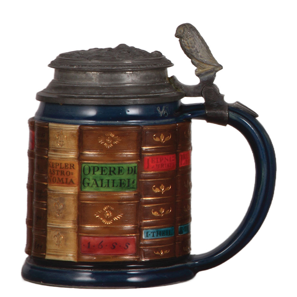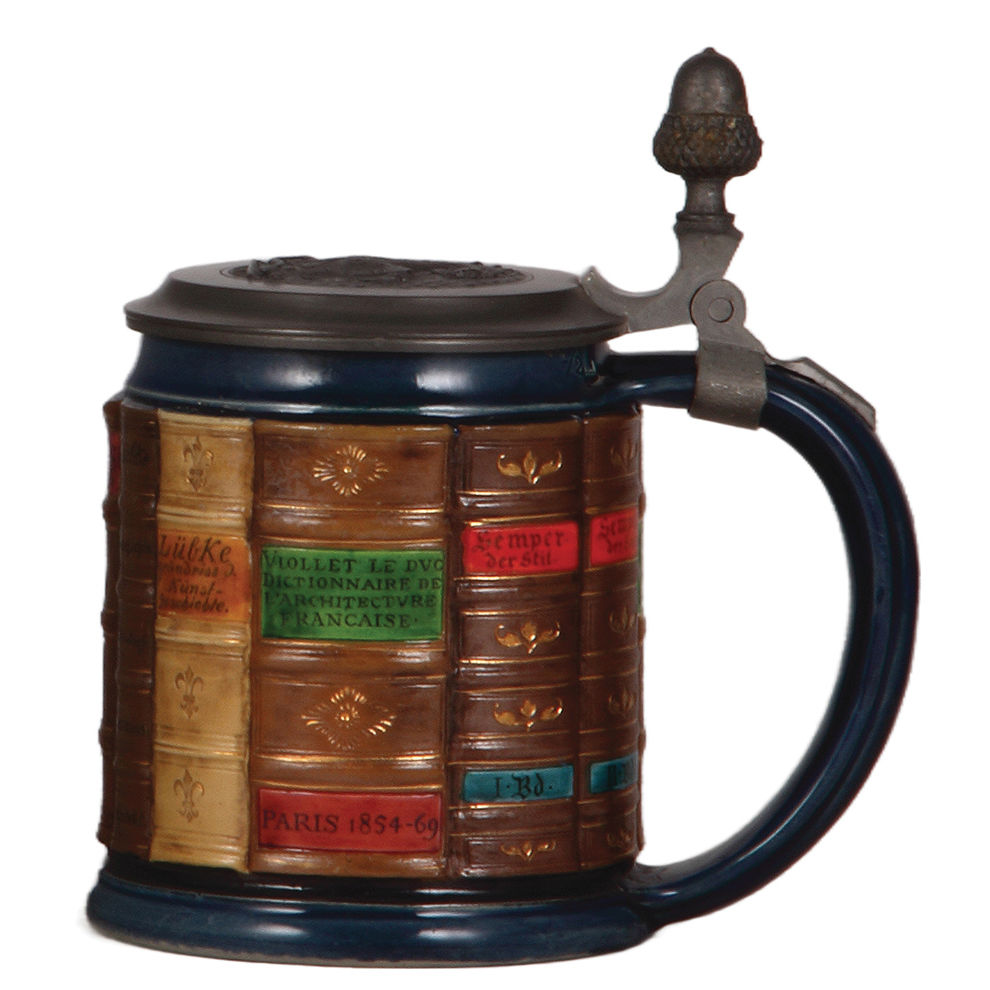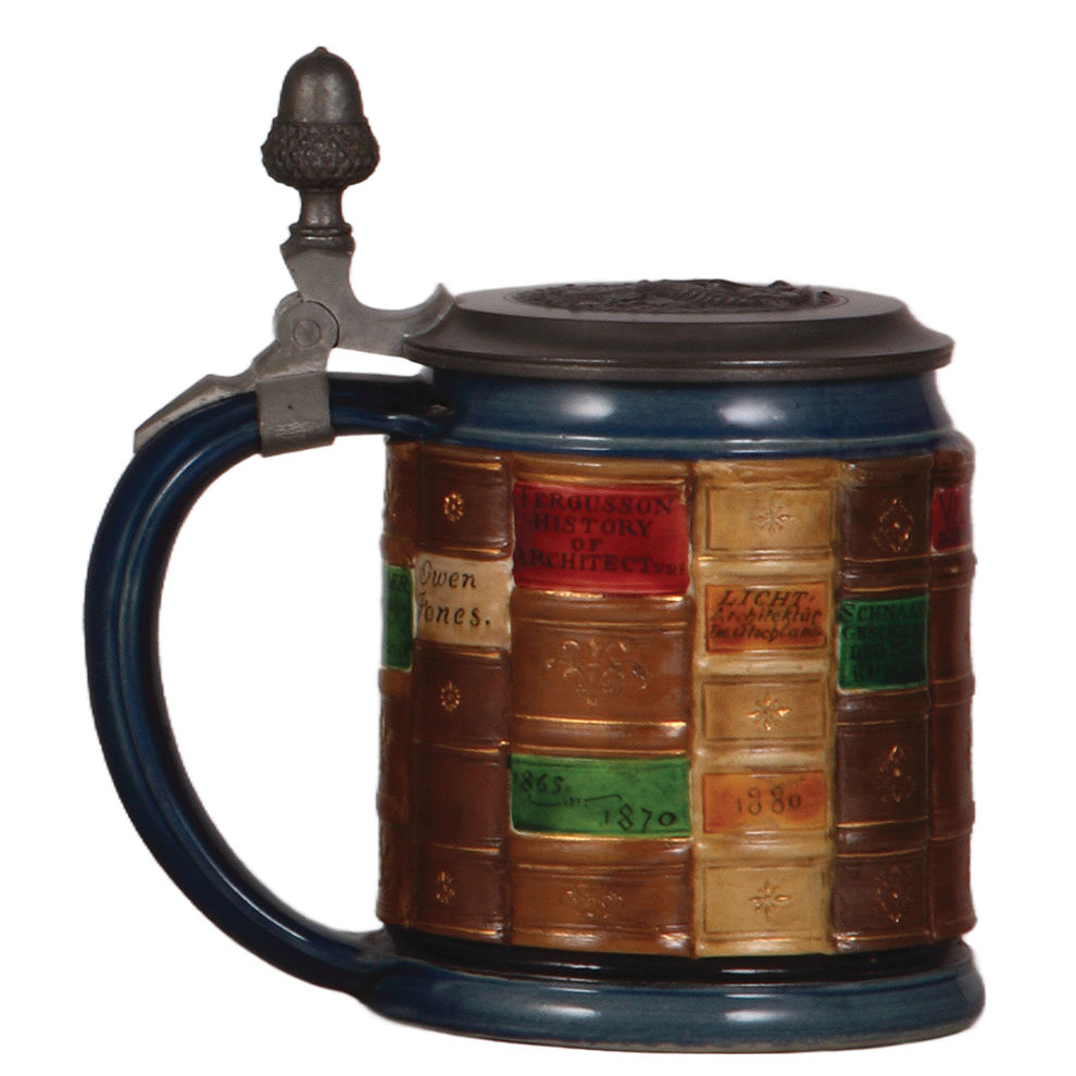 Mettlach steins, two, .5L, 2001D, decorated relief, Book stein Mathematics, pewter lid is old replacement; with, .5L, 2001F, decorated relief, Book stein Architecture, original pewter lid, mint.