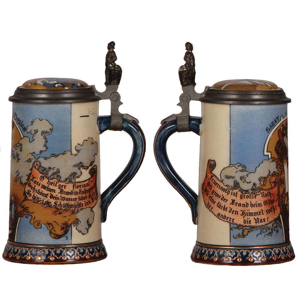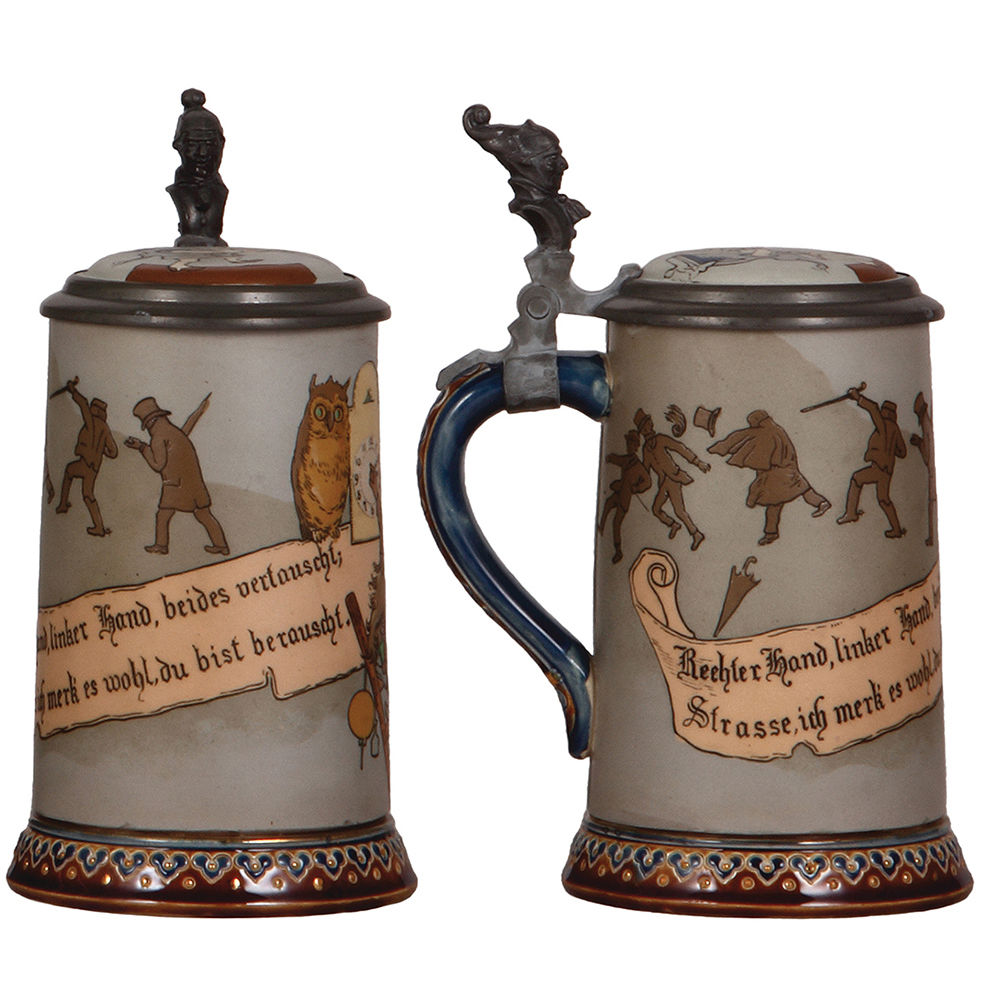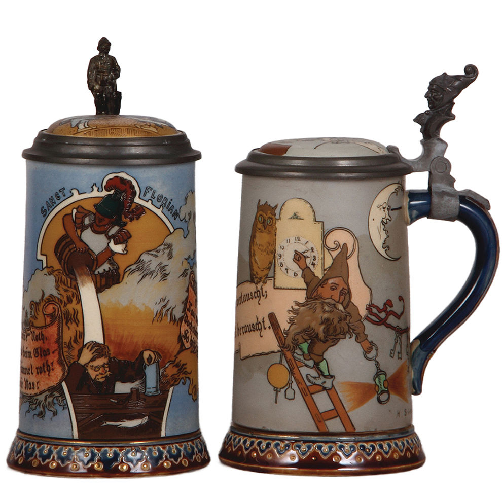 Mettlach steins (two), .5L, 2091, & .5L, 2092, etched, by H. Schlitt.