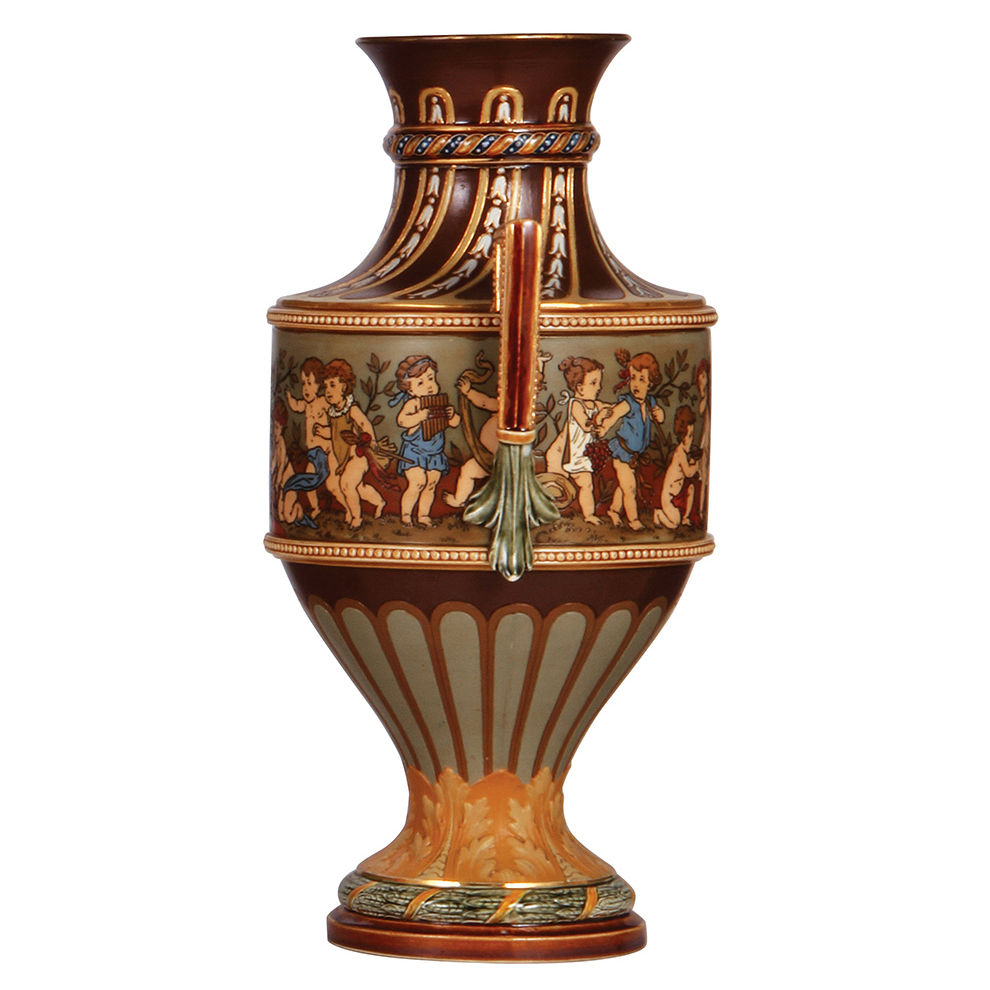 Mettlach vase, 12.2″ ht., 2127, etched, excellent flake repair in rear, otherwise mint.