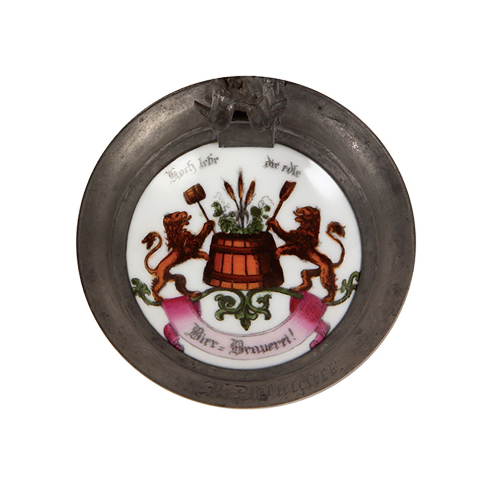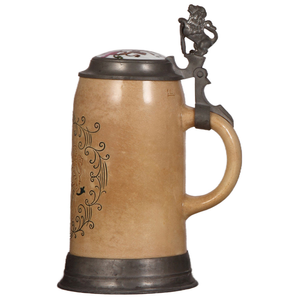Occupation stein, 1.0L, pottery, etched, marked M. & W., by Merkelbach & Wick, Hochlebe die Brauerei, long live the brewery!, porcelain inlaid lid: Bier – Brauerei, pewter base, glaze browning, otherwise mint.