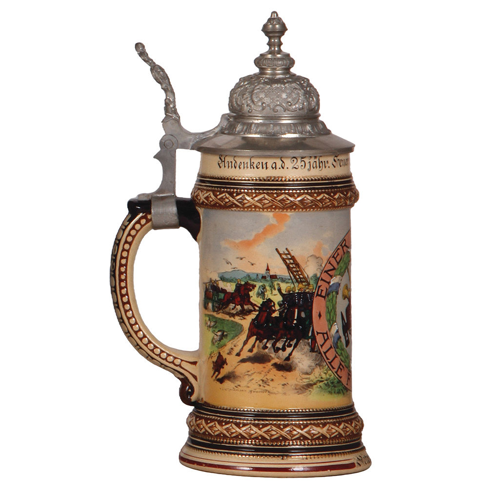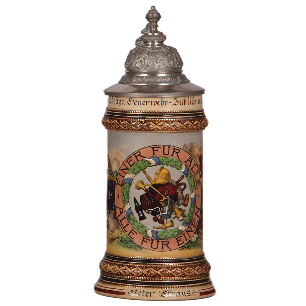 Occupation stein, .5L, pottery, transfer & hand-painted, 25 jähre feuerwehr – Jubiläum Grünenbeindt 1913, named: Peter Kraus, pewter lid, wonderful scenes, mint.