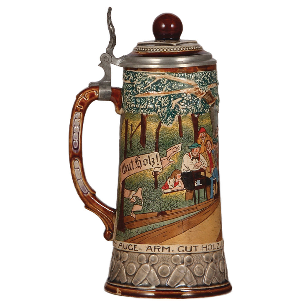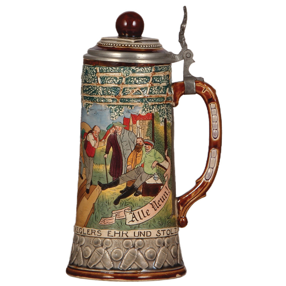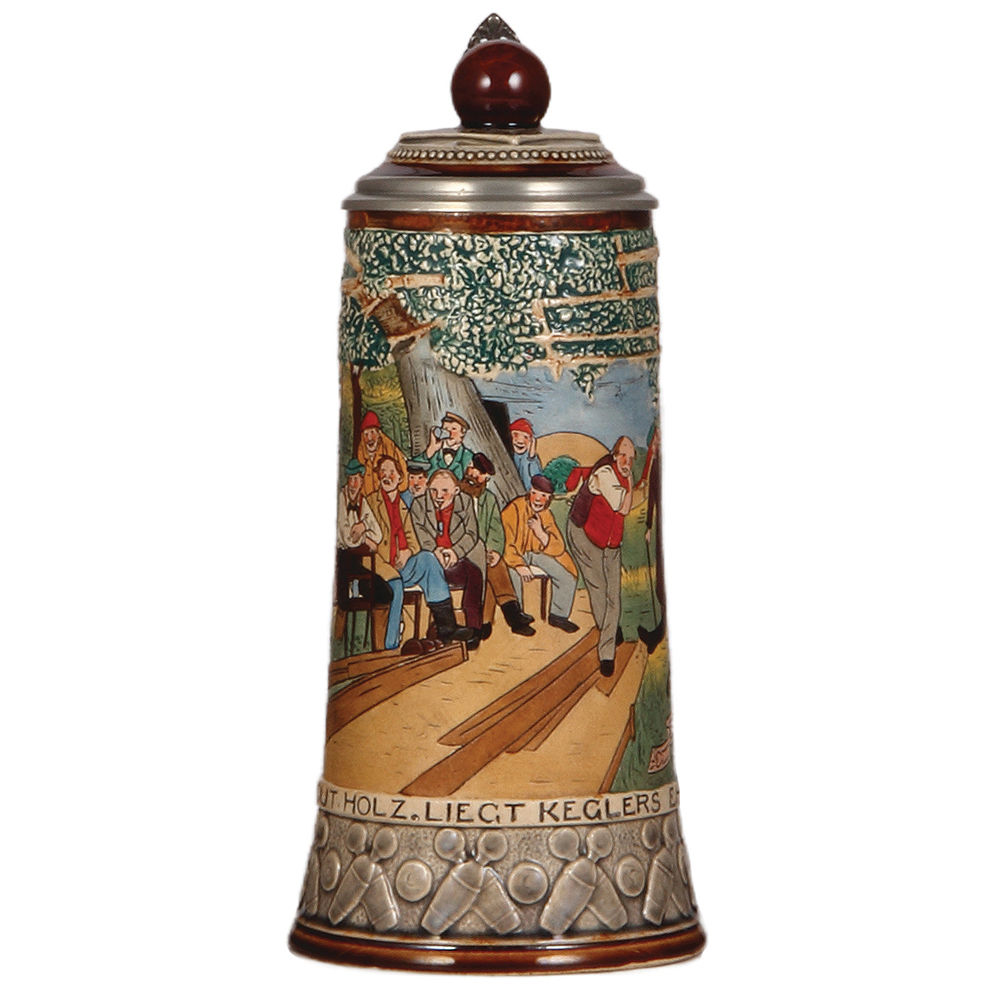 Pottery stein, .5L, etched, by J.W. Remy, #1410, bowling, figural inlaid lid, mint.