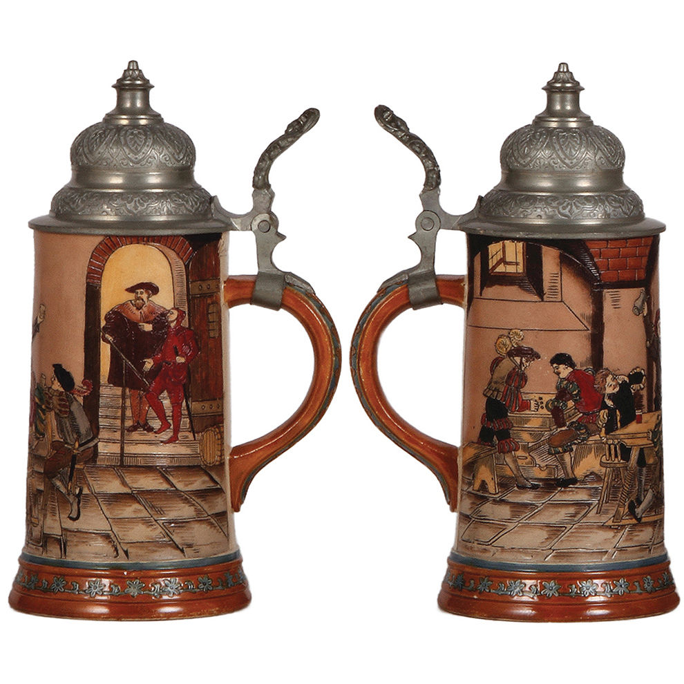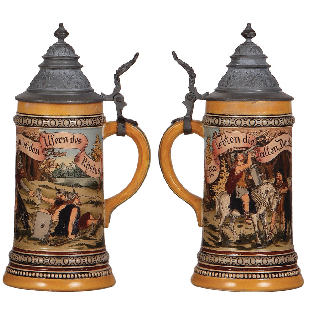 Pottery steins (two), .5L, etched, marked H.R., 409, by Hauber & Reuther, pewter lid, mint; with, .5L, etched, marked H.R., 429, by Hauber & Reuther, pewter lid, mint.