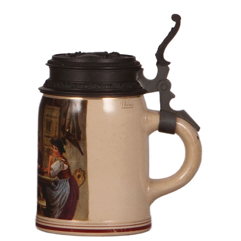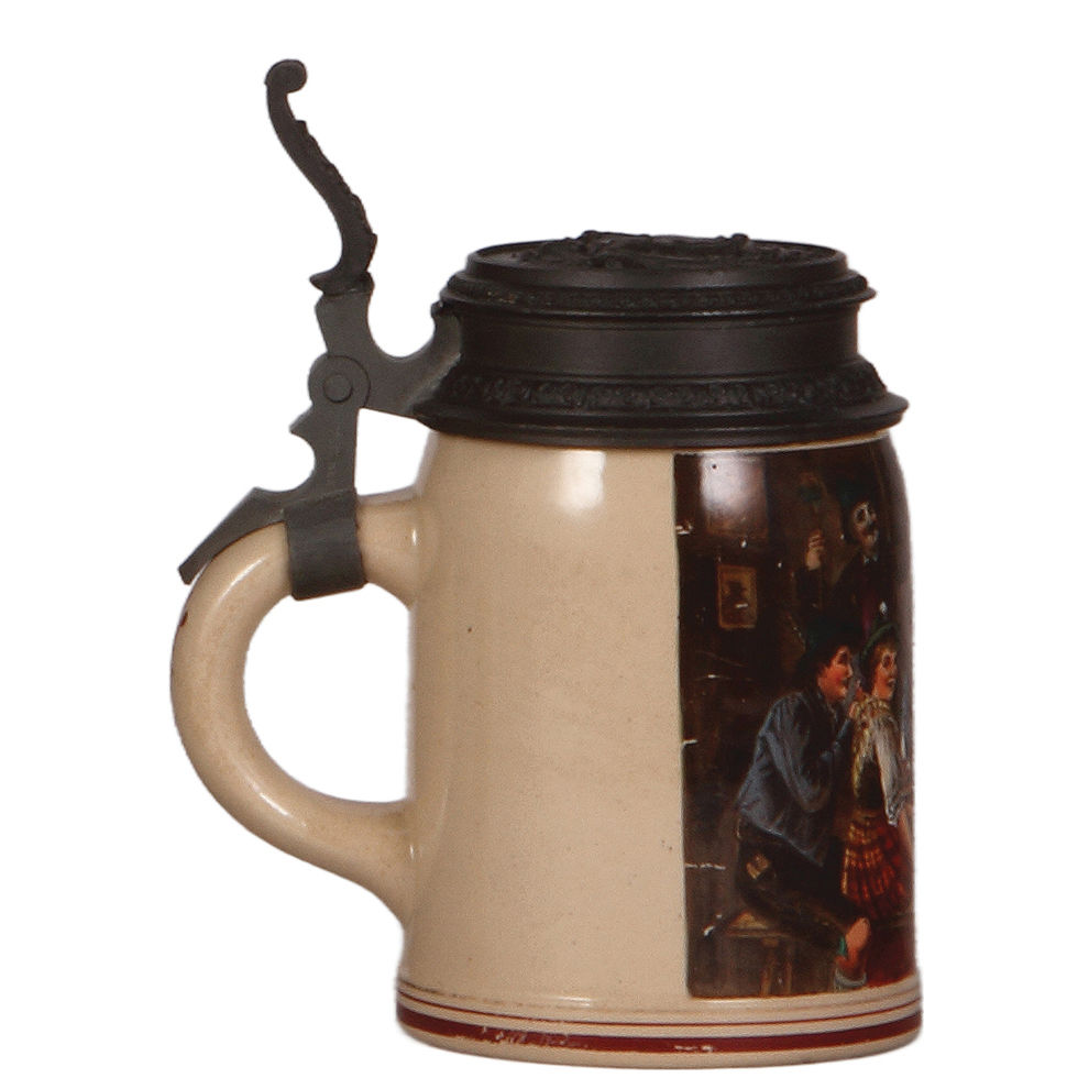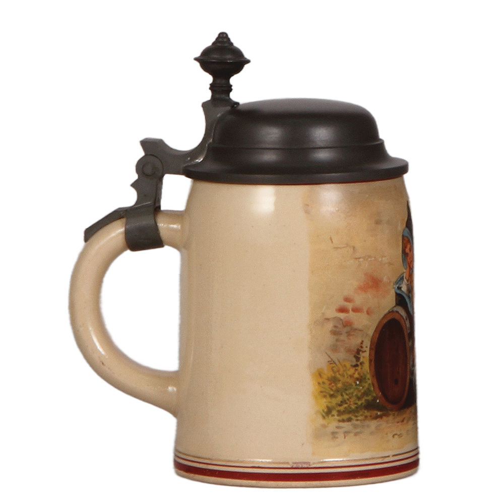 Pottery steins, two, .5L, transfer & hand-painted, by Martin Pauson, München, Münchner Kindl, pewter lid, mint; with, .5L, by Martin Pauson, München, Gasthaus scene, relief pewter lid, minor scuffs, otherwise mint.