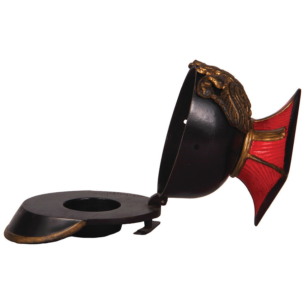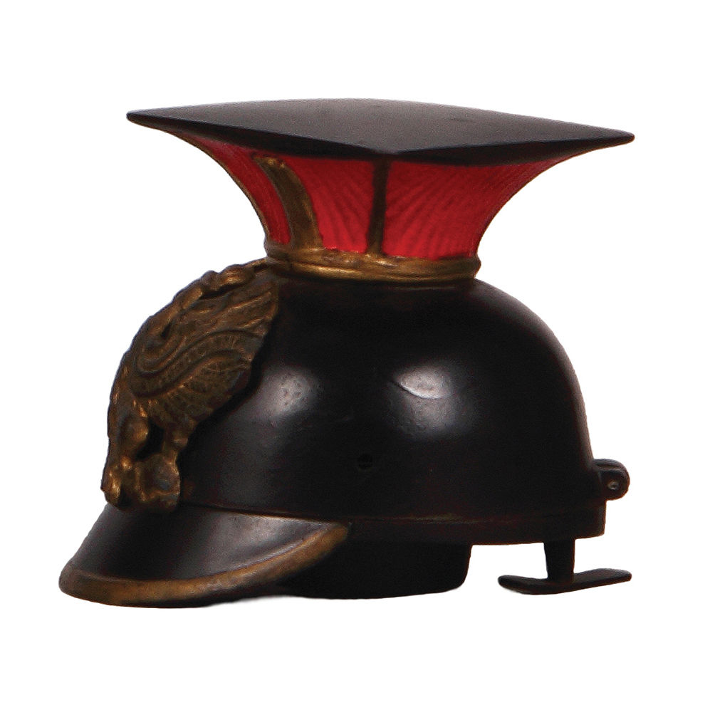 Regimental inkwell, iron, 4.2″ ht., Ulanen helmet, small piece of hinge missing – works ok, missing glass bowl inside.