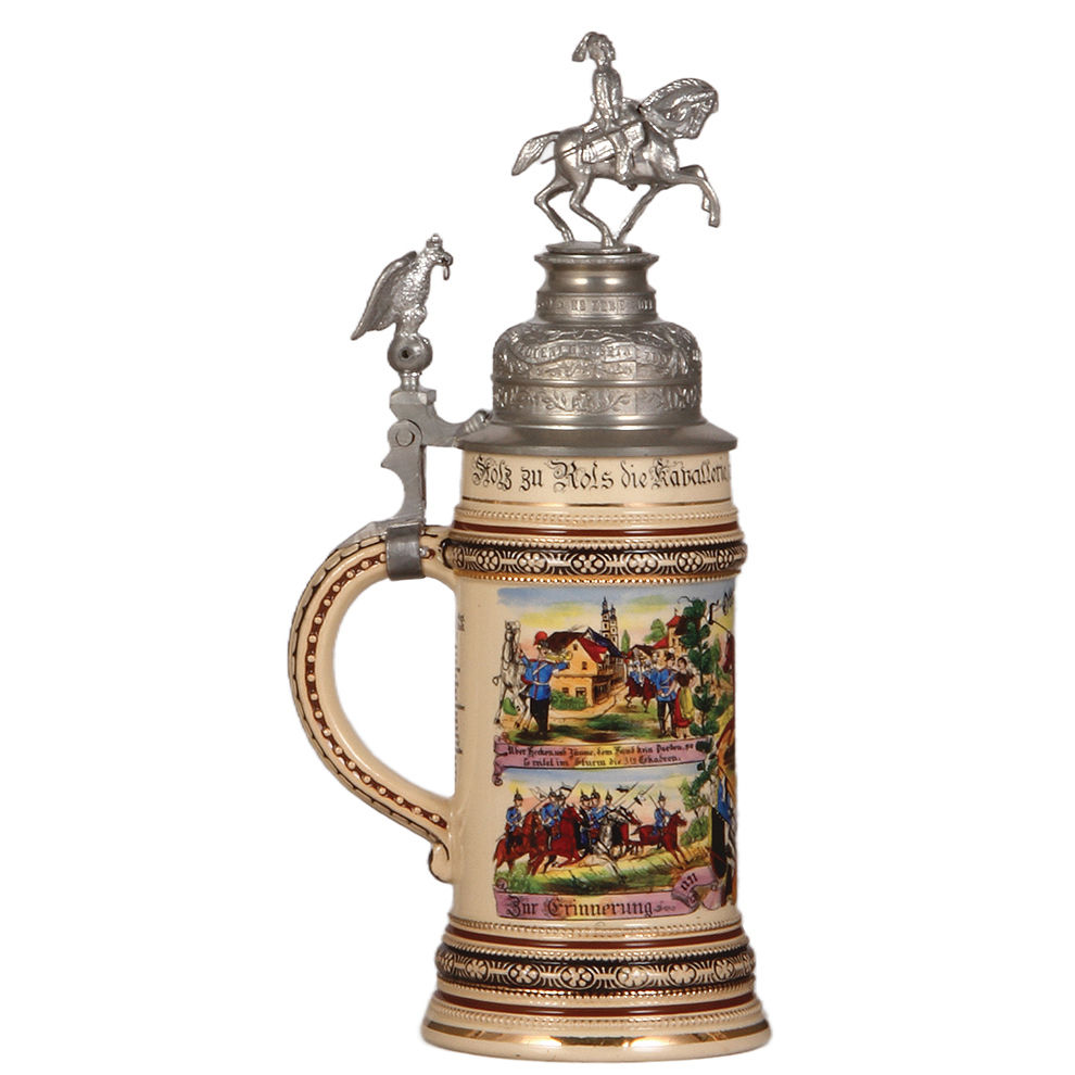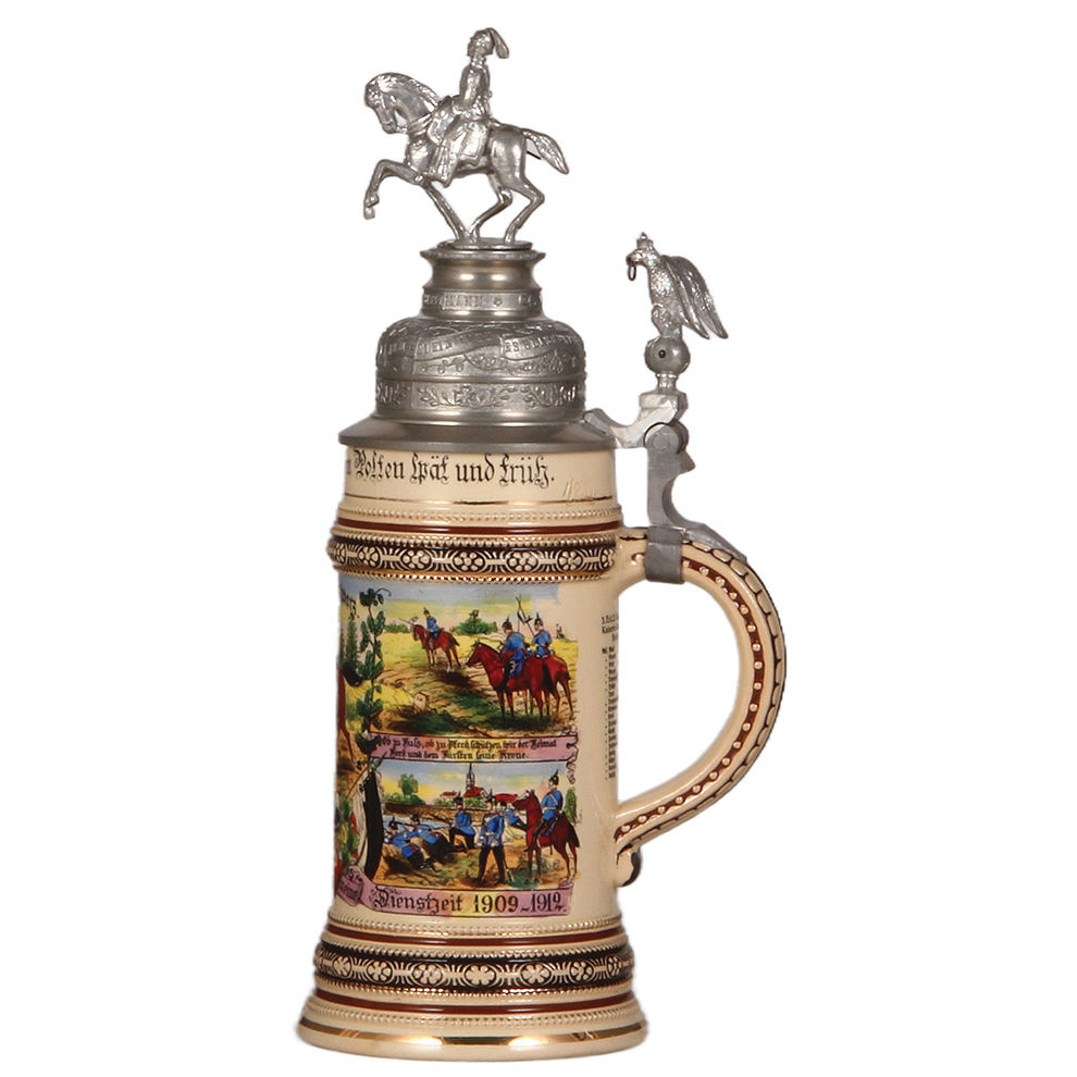 Regimental stein, .5L, 12.4″ ht., pottery, 3. Esk., 2. Garde Drag. Regt., Berlin, 1909 – 1912, four side scenes, roster, eagle thumblift, named to: Otto Schwarz, mint.