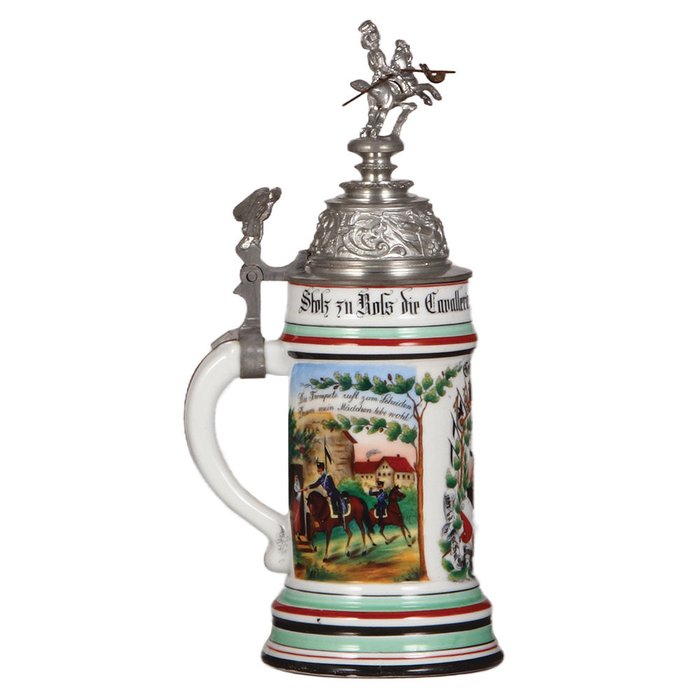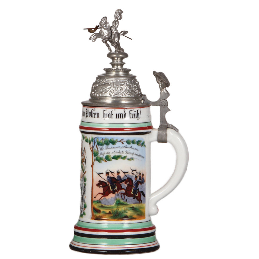 Regimental stein, .5L, 11.5″ ht., porcelain, 4. Esc., Husaren Regt. Nr. 15, Wandsbek, 1897 – 1900, two side scenes, eagle thumblift, named to: Gefr. Finau, mint.