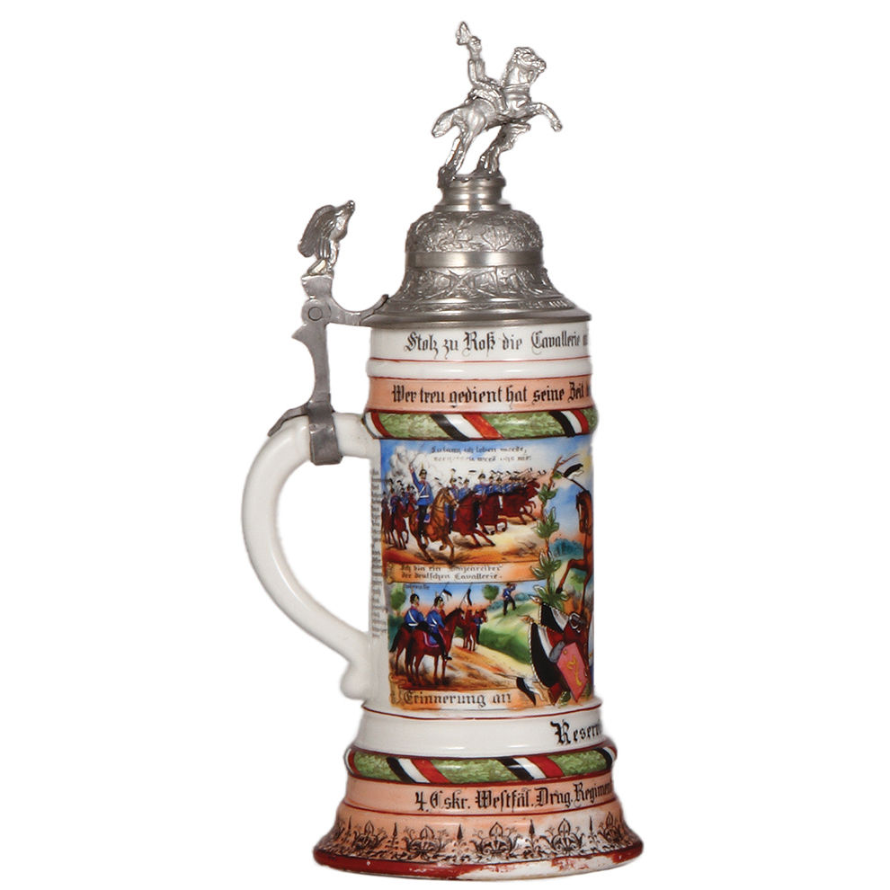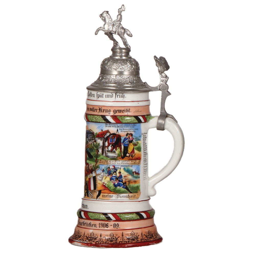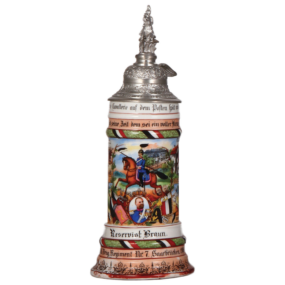 Regimental stein, .5L, 12.5″ ht., porcelain, Drag. Regt. Nr. 7, 4. Esk., Saarbrücken, 1906 – 1909, four side scenes, roster, eagle thumblift, named to: Reservist Braun, some color wear on base, lid painted silver.