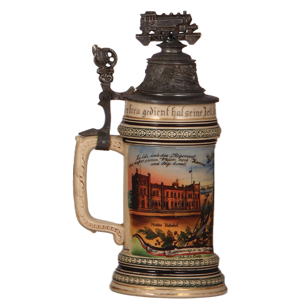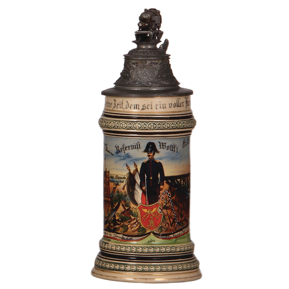 Regimental stein, .5L, 10.5″ ht., pottery, 1. Comp., Eisenbahn Regt. Nr. 3, Berlin & Betriebs Abteilung, 1903 – 1905, two side scenes, winged-wheel thumblift, named to: Reservist Wolff I, some gold and black worn, pewter tear poorly repaired, new finial poorly attached.