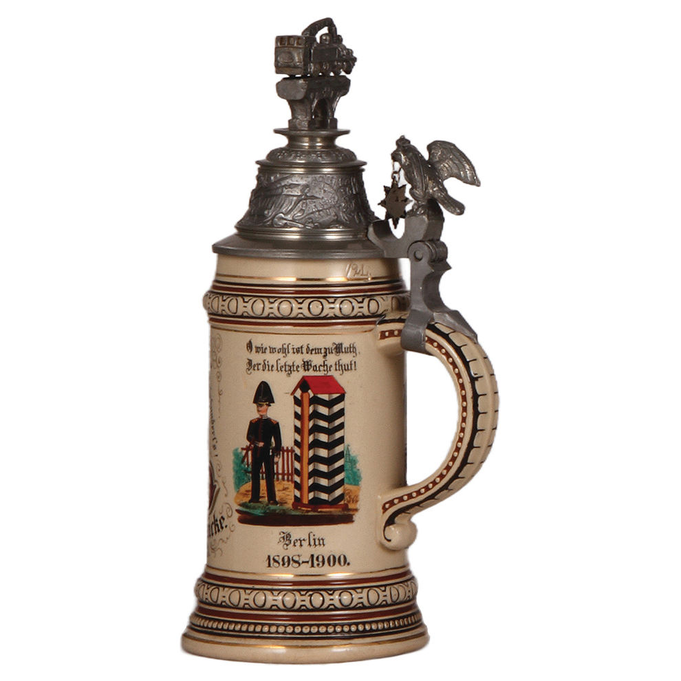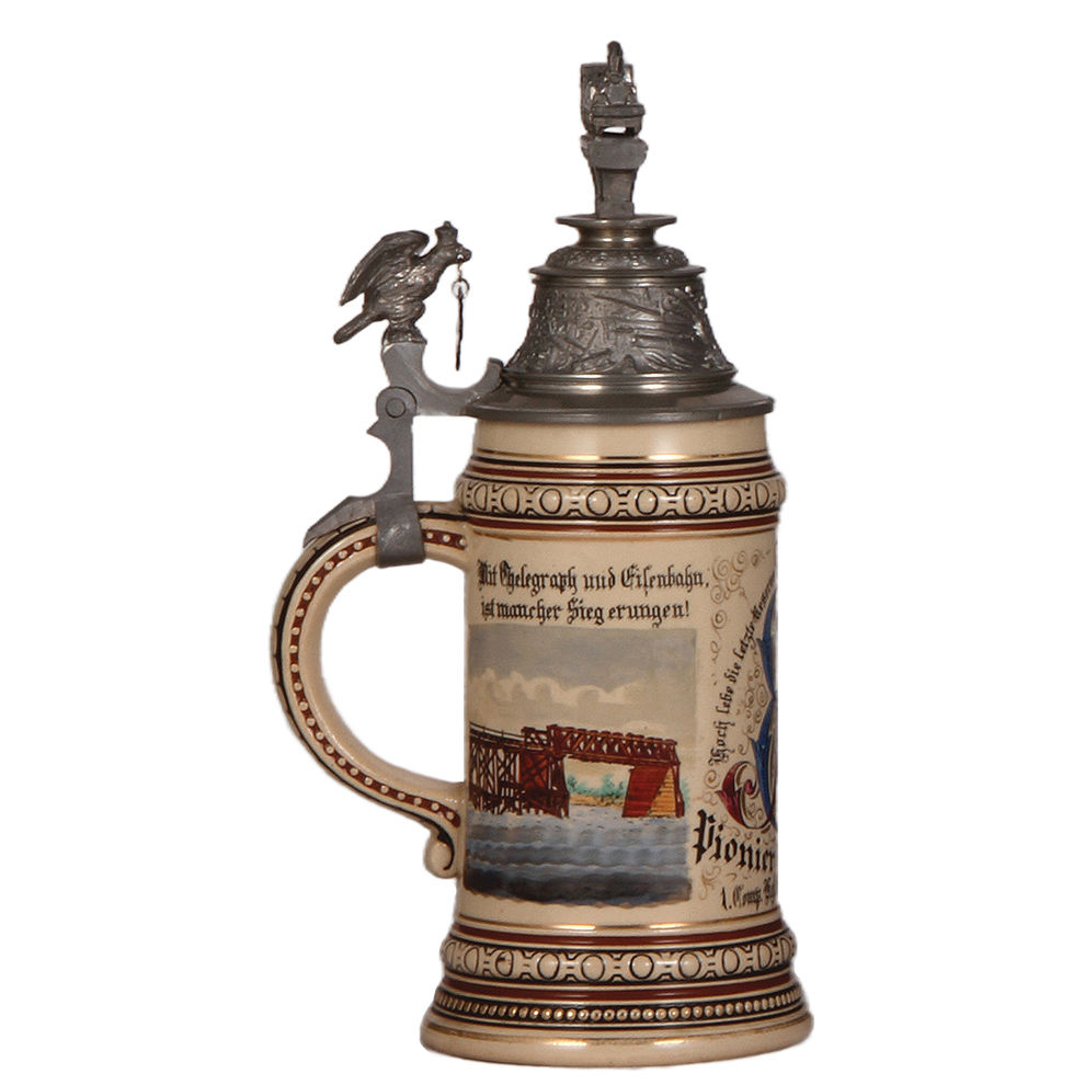 Regimental stein, .5L, 10.5″ ht., pottery, 1. Comp., Eisenbahn Regt. Nr. 3, Berlin, 1898 – 1900, two side scenes, eagle thumblift, named to: Pionier Heinrich, mint.
