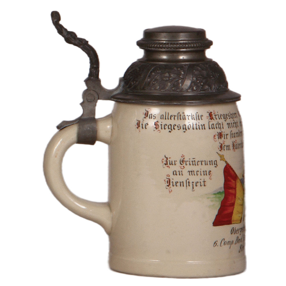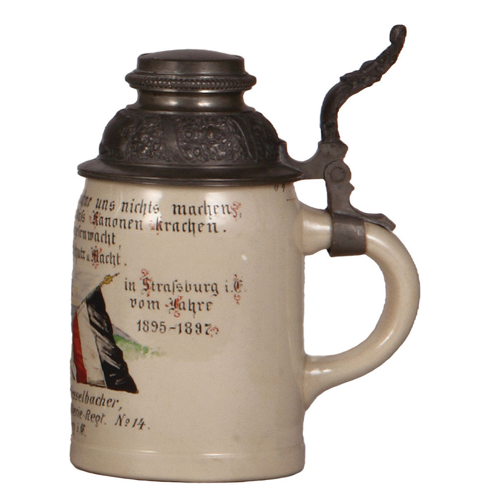 Regimental stein, .5L, marked Saarguemines, 6. Comp. Fussartillerie Regt. No 14., Strassburg i. E., 1895 – 1897, named to: Obergefreiter Hesselbacher, mint.