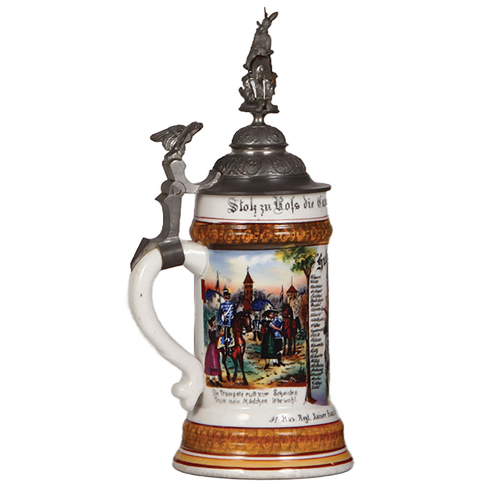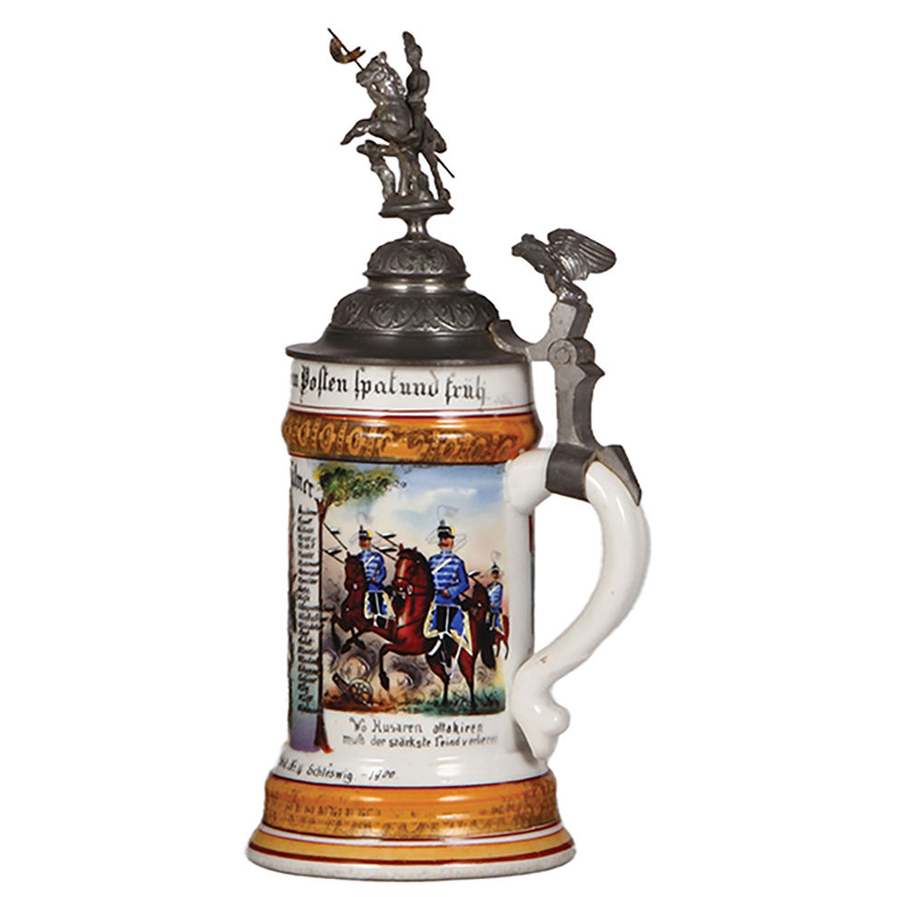 Regimental stein, .5L, 11.2″ ht., porcelain, 2. Esk., Husaren Regt. Nr. 16, Schleswig, 1897 – 1900, two side scenes, roster, eagle thumblift, named to: Husar Gülner, mint.
