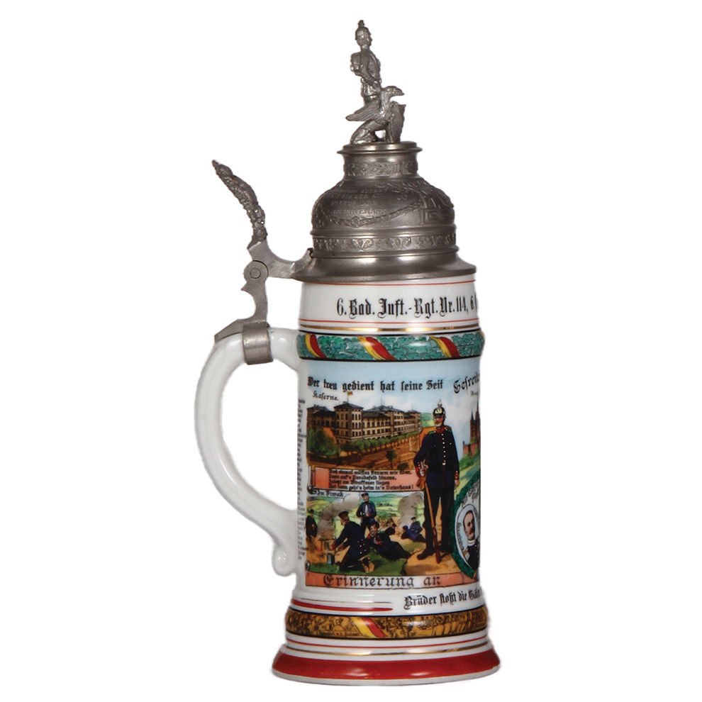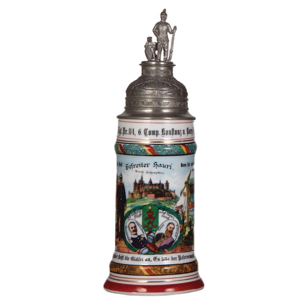 Regimental stein, .5L, 11.9″ ht., porcelain, 6. Comp., Inft. Regt. Nr. 114, Konstanz u. Burg Hohenzollern, 1907 – 1909, four side scenes, roster, unusual 114 thumblift, named to: Gefreiter Hauri, mint.