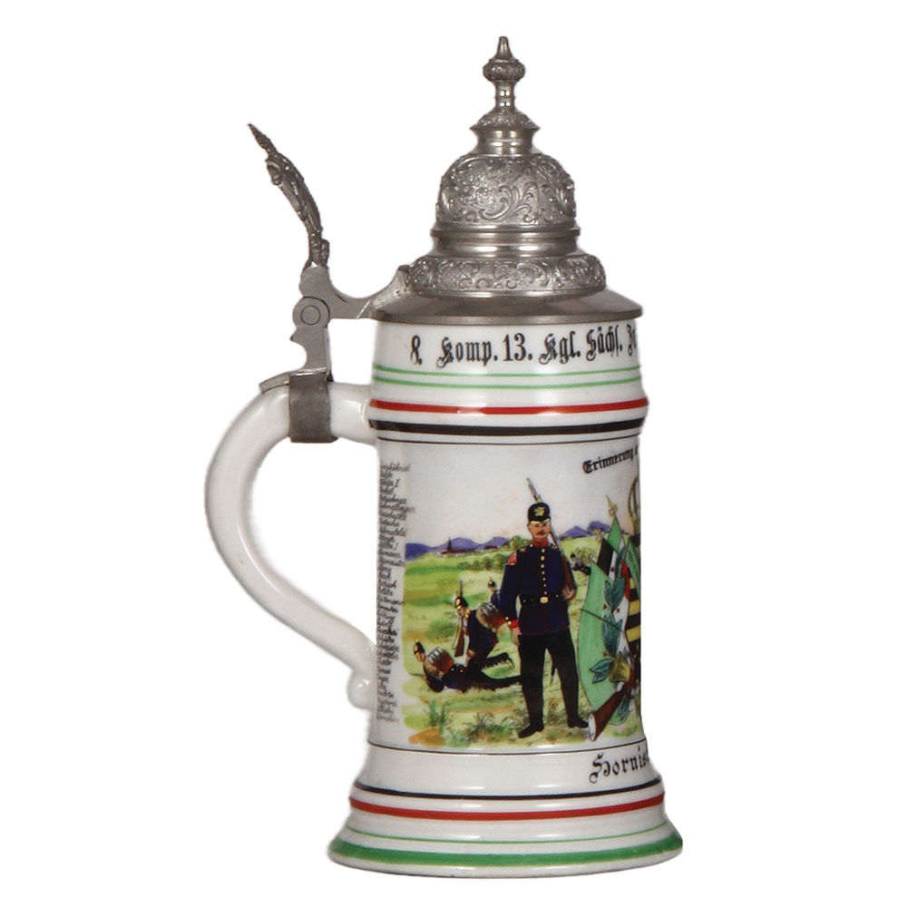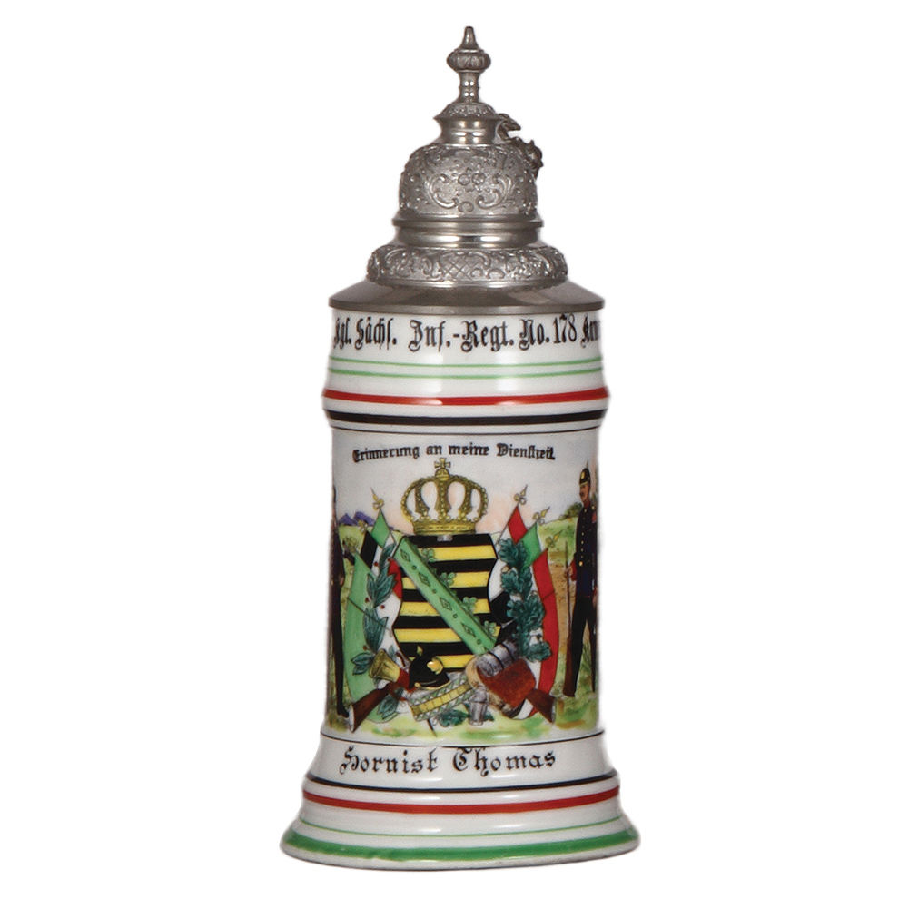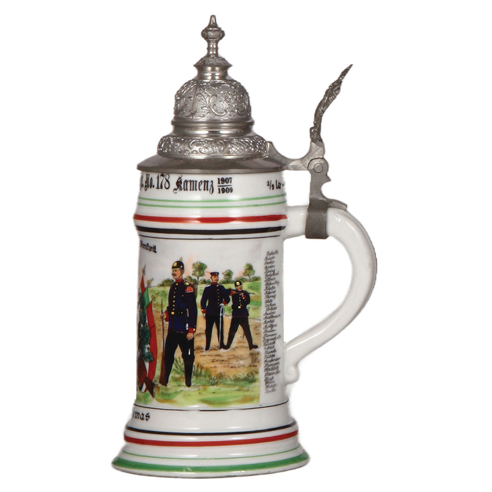 Regimental stein, .5L, 10.2″ ht., porcelain, Sächs. Inft. Regt. Nr. 178, 8. Comp., Kamenz, 1907 – 1909, two side scenes, roster, floral thumblift, named to: Hornist Thomas, mint.