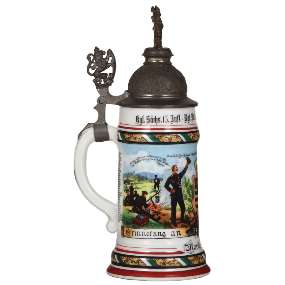 Regimental stein, .5L, 11.2″ ht., porcelain, Sächs. Inft. Regt. Nr. 181, 5. Comp., Chemnitz, 1901 – 1903, two side scenes, roster, lion thumblift (original), named to: Moritz Geithner, mint.