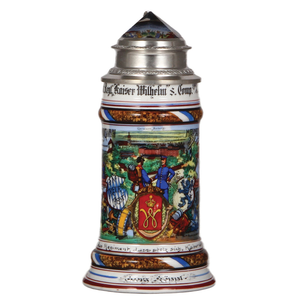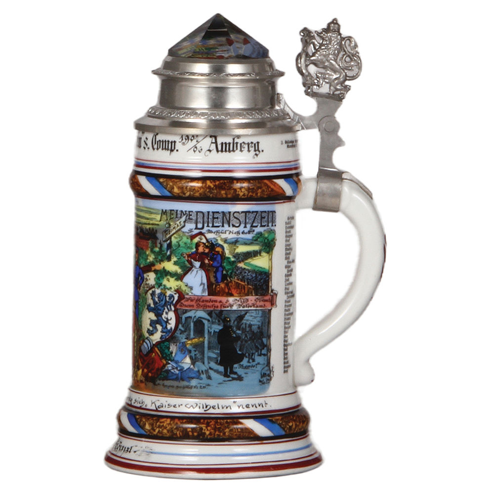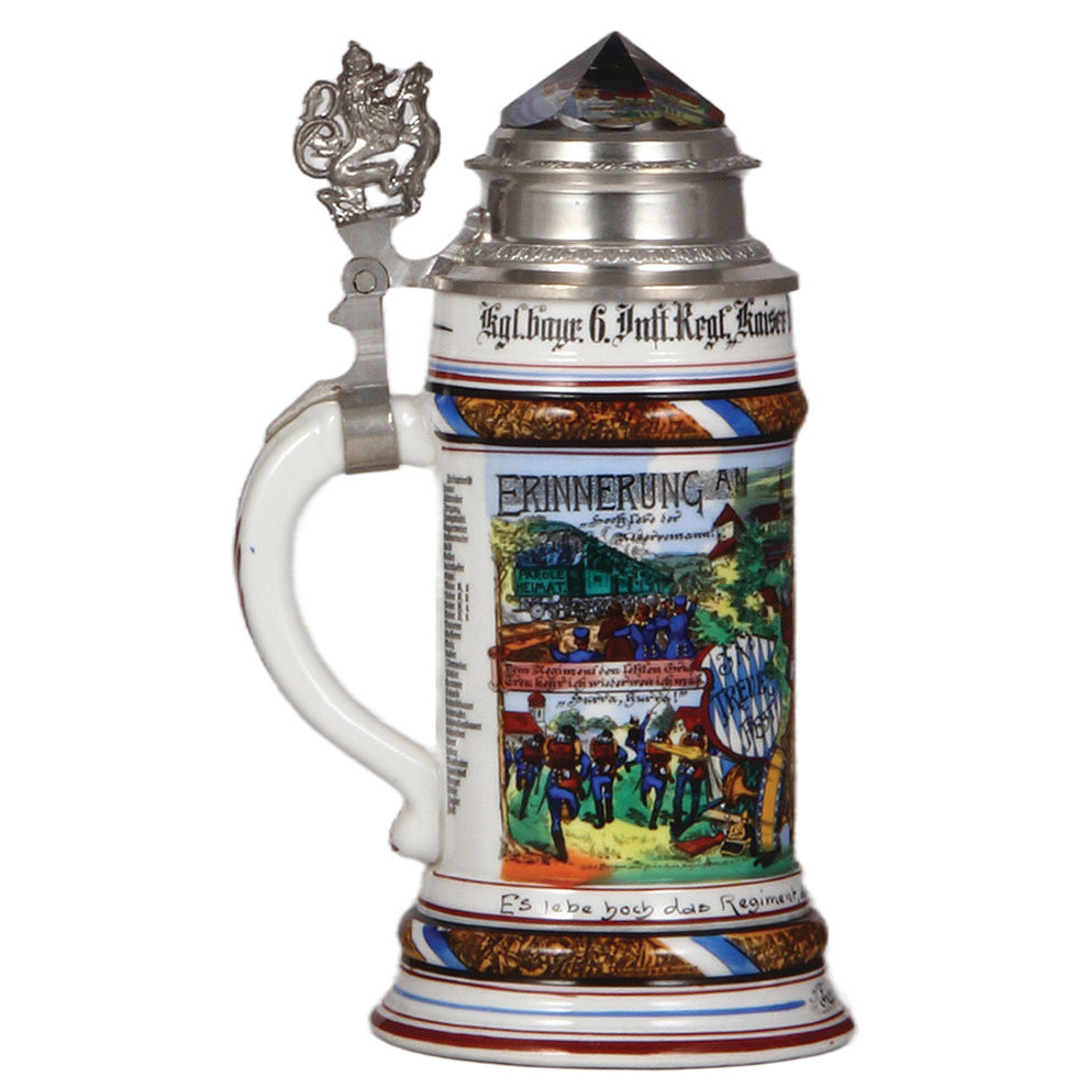 Regimental stein, .5L, 9.3″ ht., porcelain. K.b. Inft. Regt. Nr. 6, 8. Comp., Amberg, 1904 – 1906, four side scenes, lion thumblift, roster, prism lid, named to: Georg Röppl, lithophane lines, very small flake at tip of the prism.