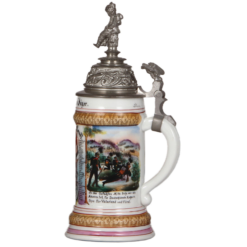 Regimental stein, .5L, 11.2″ ht., porcelain, 3. Comp., Jäger Battl. Nr. 11, Marburg, 1896 – 1898, two side scenes, roster, eagle thumblift, named to: Jäger Kornd’l, lithophane lines.