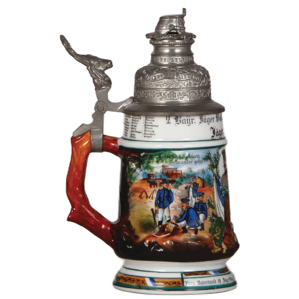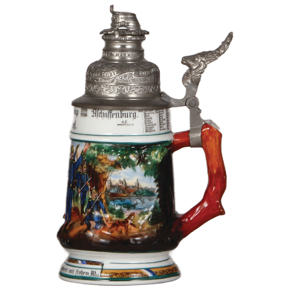 Regimental stein, .5L, 9.1″ ht., porcelain. K.b. Jäger Bat., 1. Comp., Aschaffenburg, 1906 – 1908, two side scenes, roster, St. Hubertus thumblift, named to: Jäger Nixel, mint.