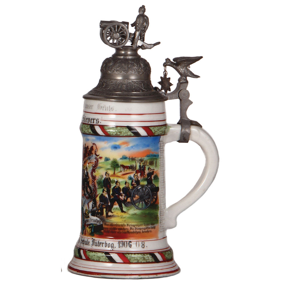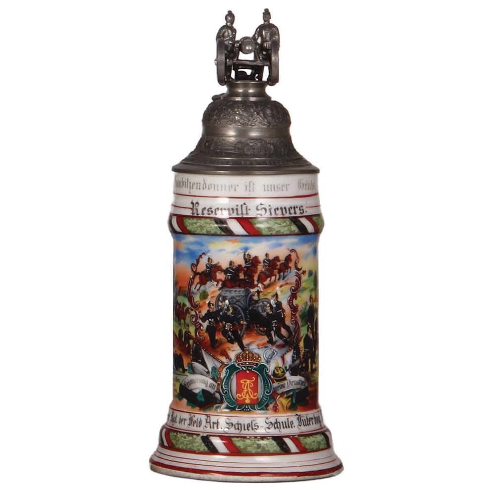 Regimental stein, .5L, 10.7″ ht., porcelain, 45. Feld Artl. Regt., & 9. Batt. Lehr Regt. der Feld Artl. Schiess-Schule, Jüterbog, 1906 – 1908, two side scenes, eagle thumblift, named to: Reservist Sievers, some word and roster wear.