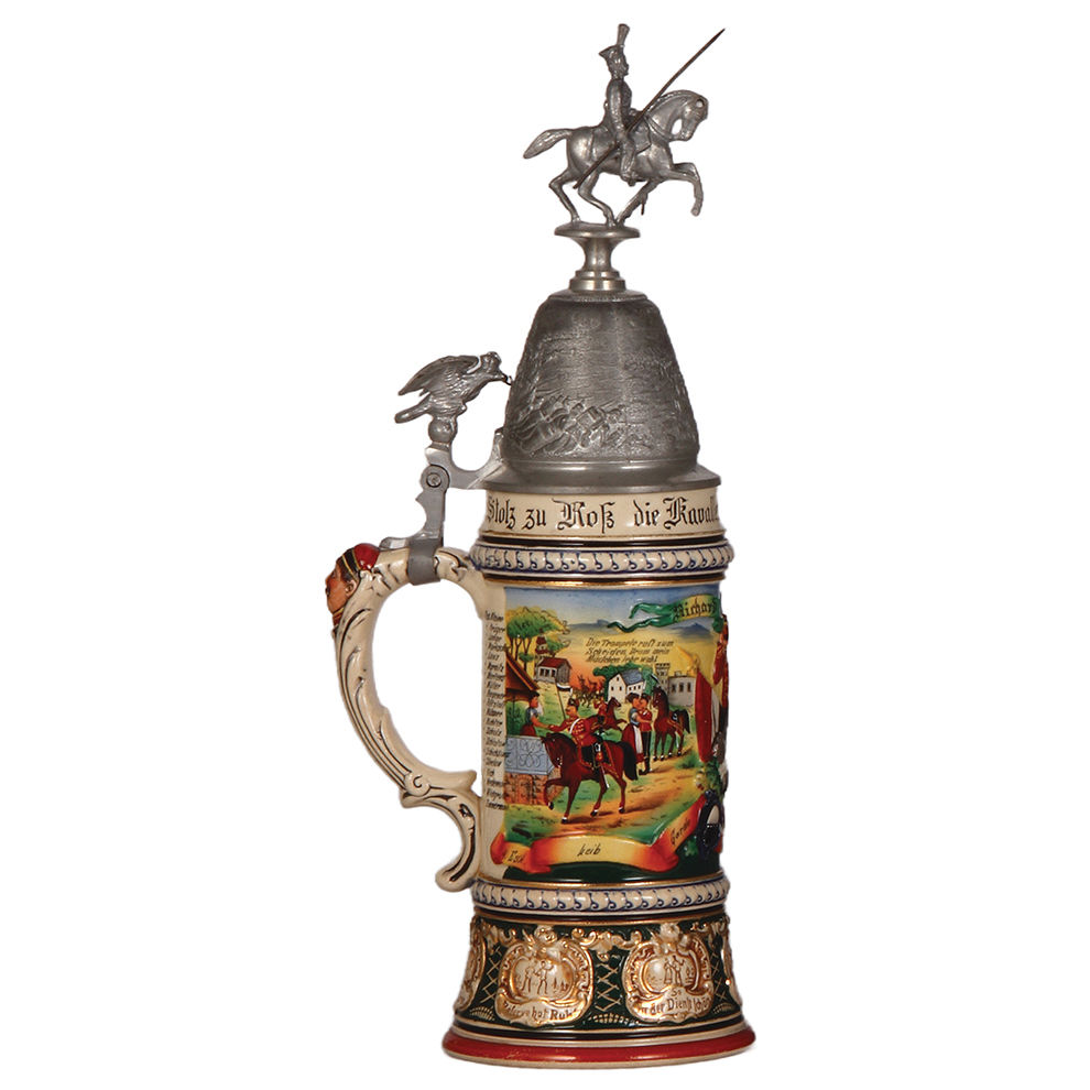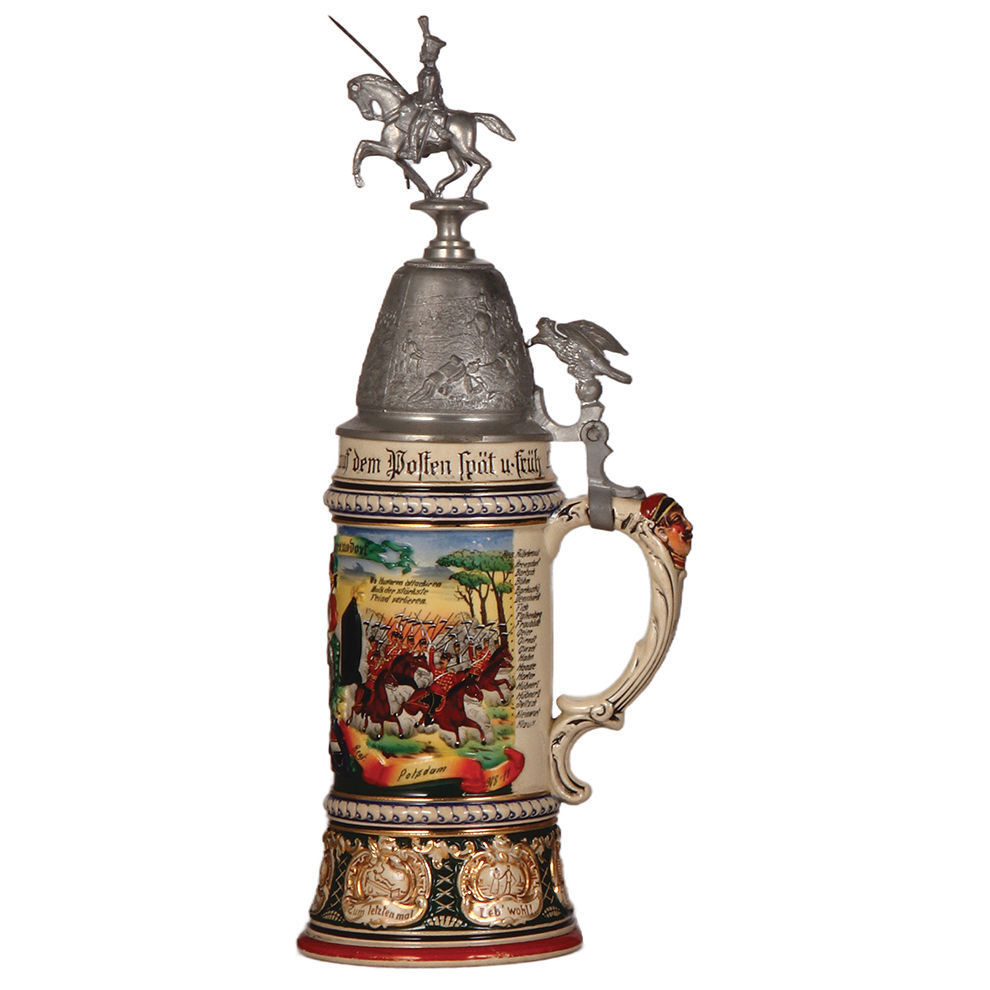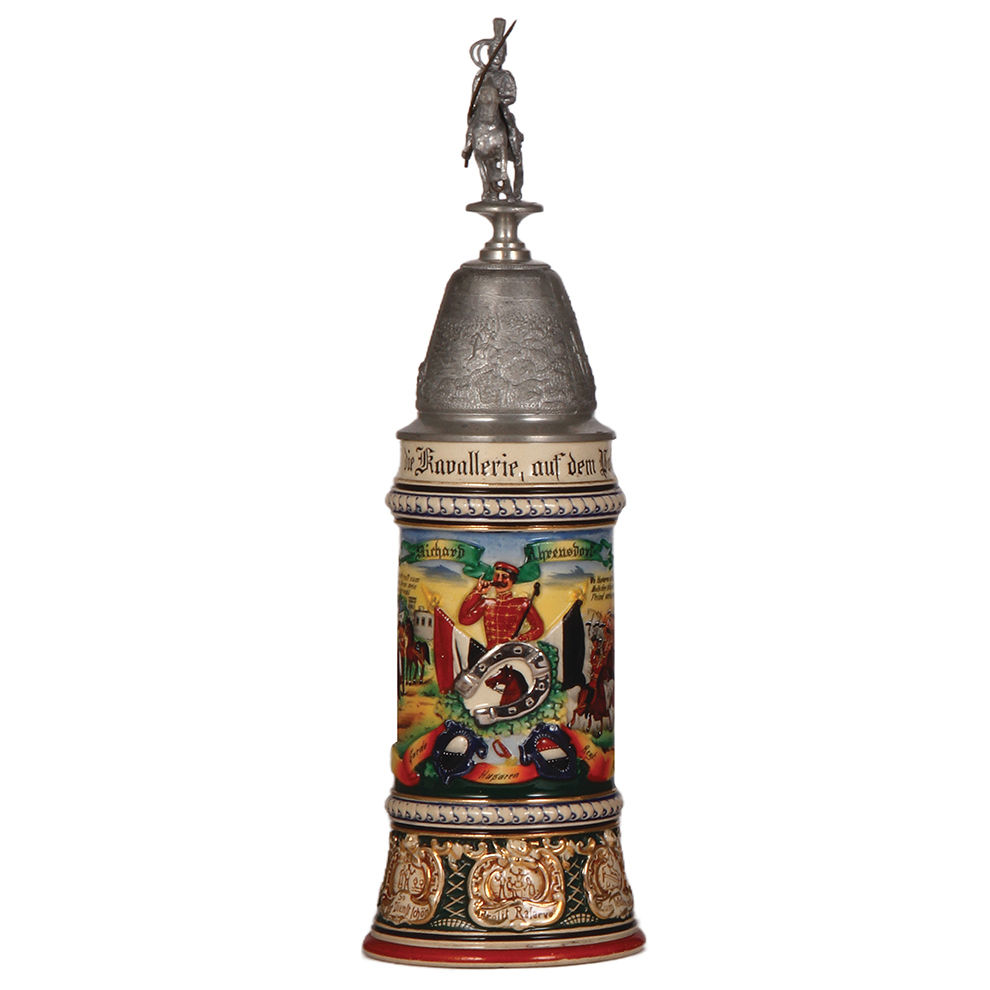 Regimental stein, .5L, 14.5″ ht., pottery, 4. Esk., Leib Garde Husaren Regt., Potsdam, 1908 – 1911, two side scenes, roster, eagle thumblift, named to: Richard Ahrensdorf, mint.