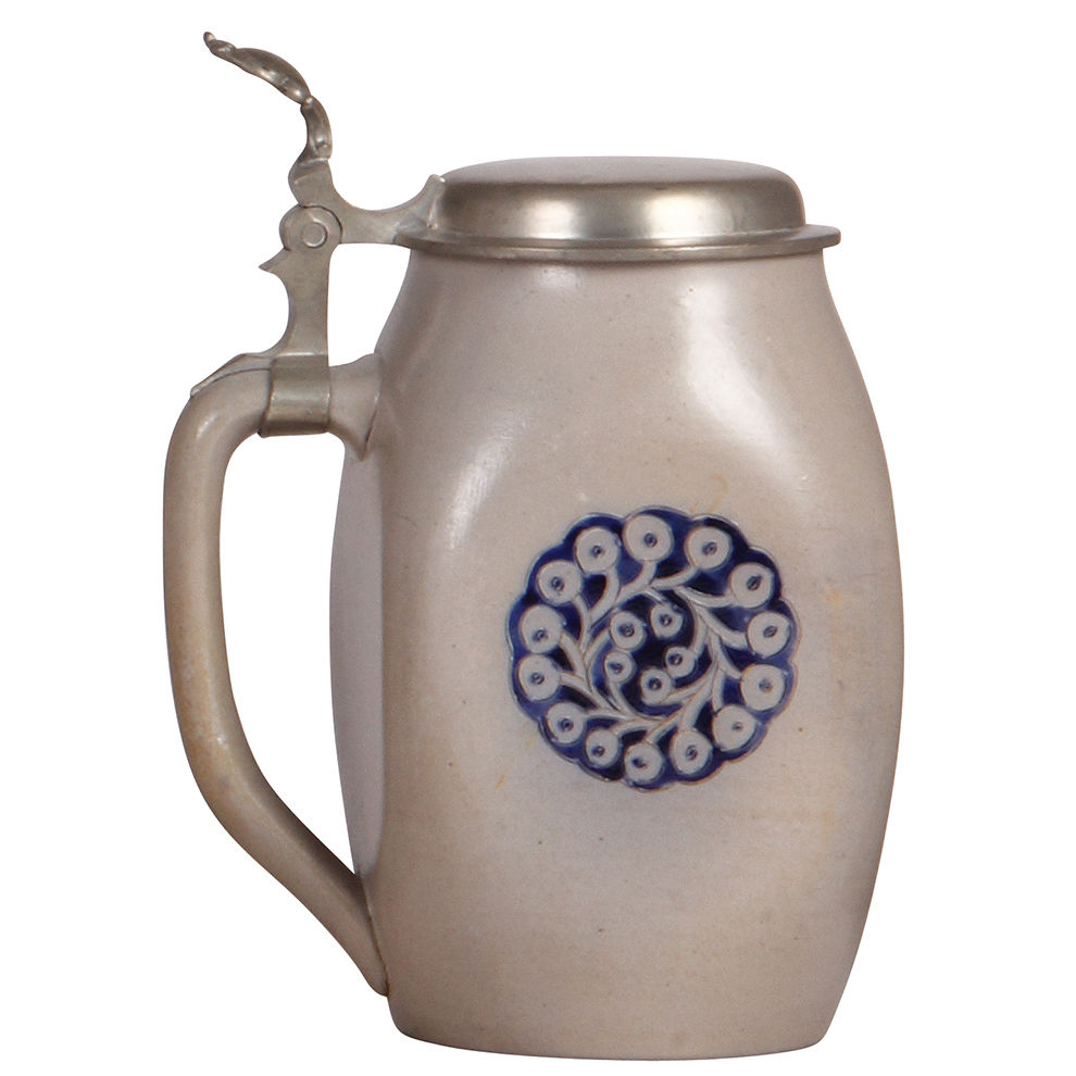 Stoneware stein, 1.0L, incised, 1741, made by Reinhold Merkelbach, designed by R. Riemerschmid, blue saltglaze, Art Nouveau, pewter lid, mint